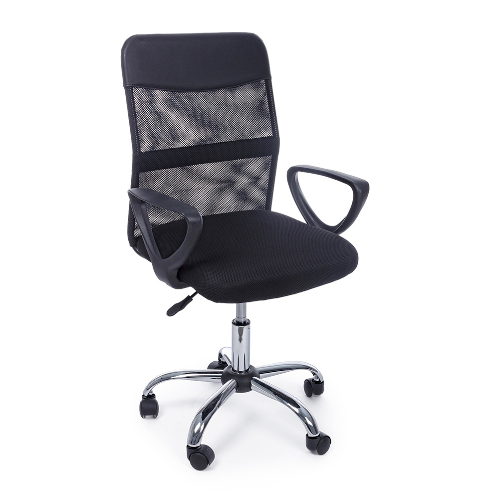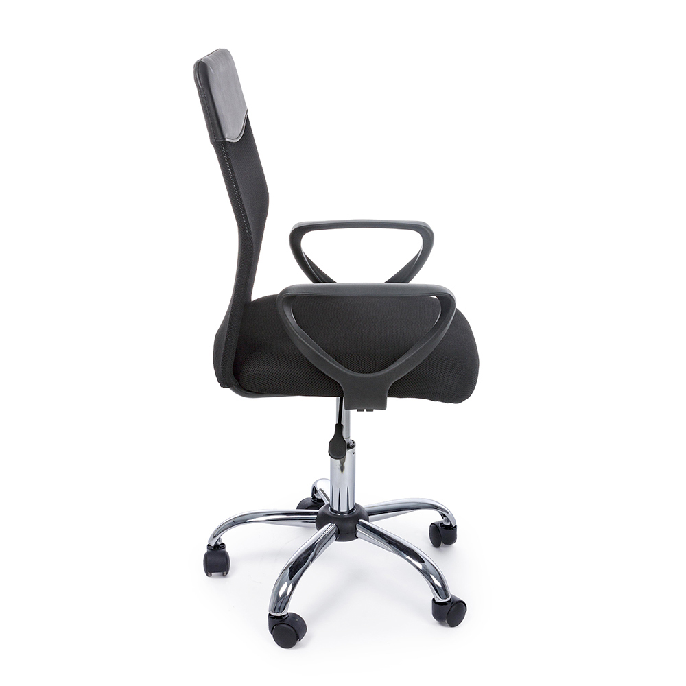 Kjo karrige zyre është bërë me një bazë të fortë çeliku tëkromuar me diametër 53 cm dhe rrota najloni. Sedilja e rregullueshme në lartësi është e mbushur dheveshur me susta me pëlhurë 100% poliestër ndërsa mbështetësja është e veshur me pëlhurë rrjetë 100% poliester me futje lëkure imituese. Mbështetëse krahësh në plastikë (polipropileni). Dizajn për t'u mbledhur.