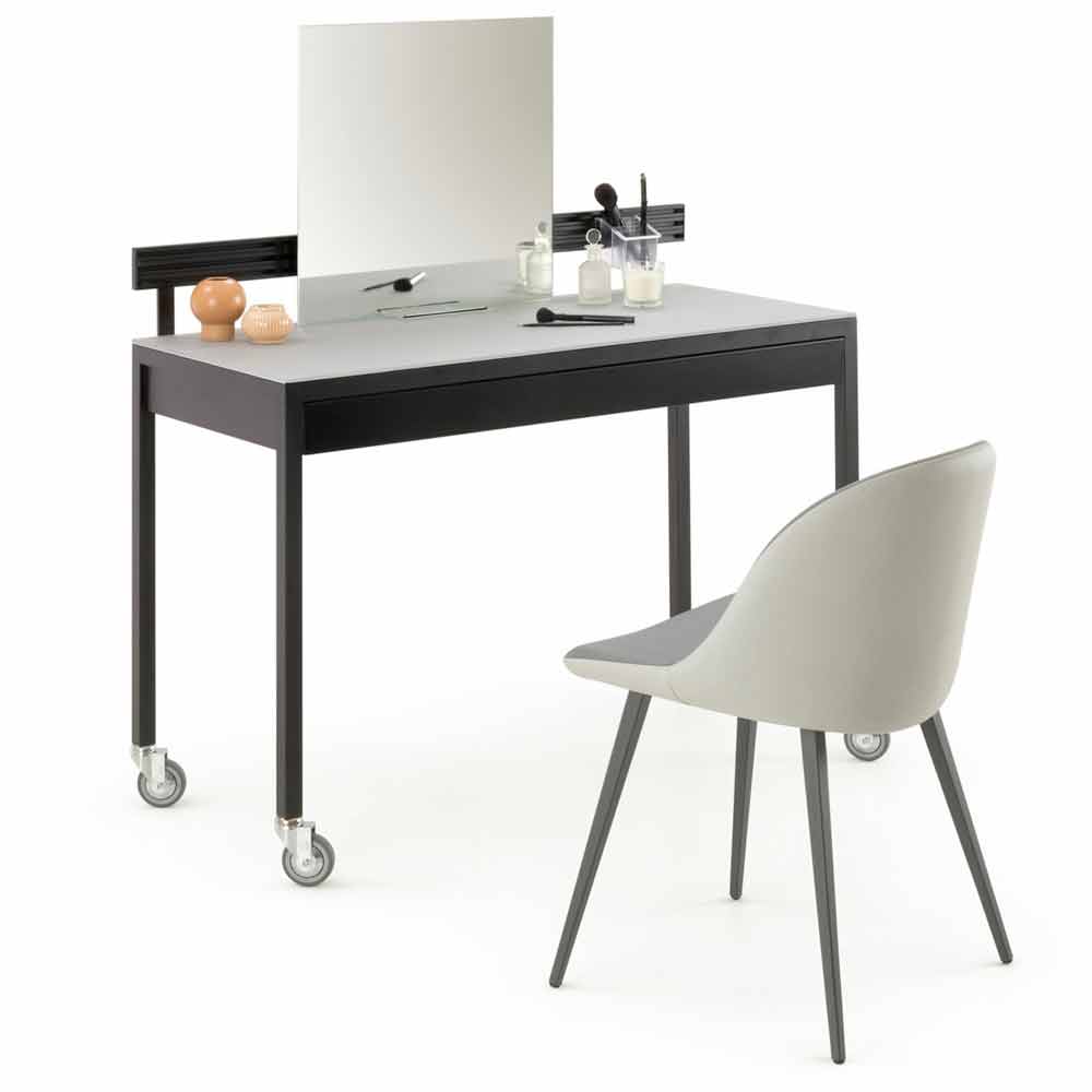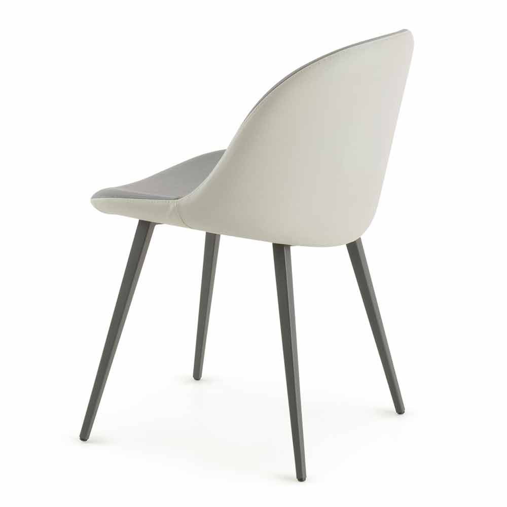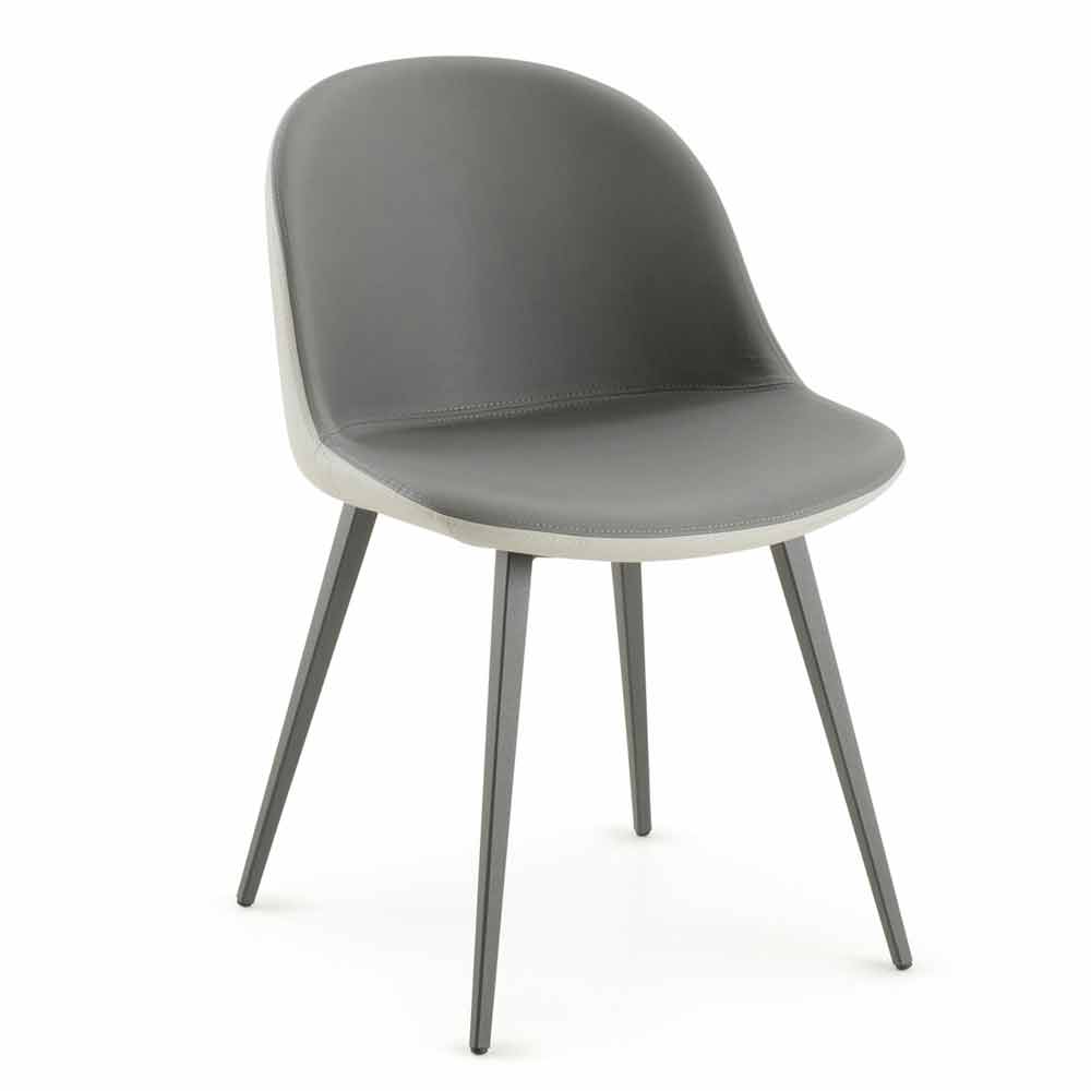 Karrige elegante për dhomën e ngrënies ose kuzhinën e prodhuar në Itali me guaskë të mbuluar me eko-lëkurë argjendi dhe antraciti dhe strukturë në metal të lyer me grafit.