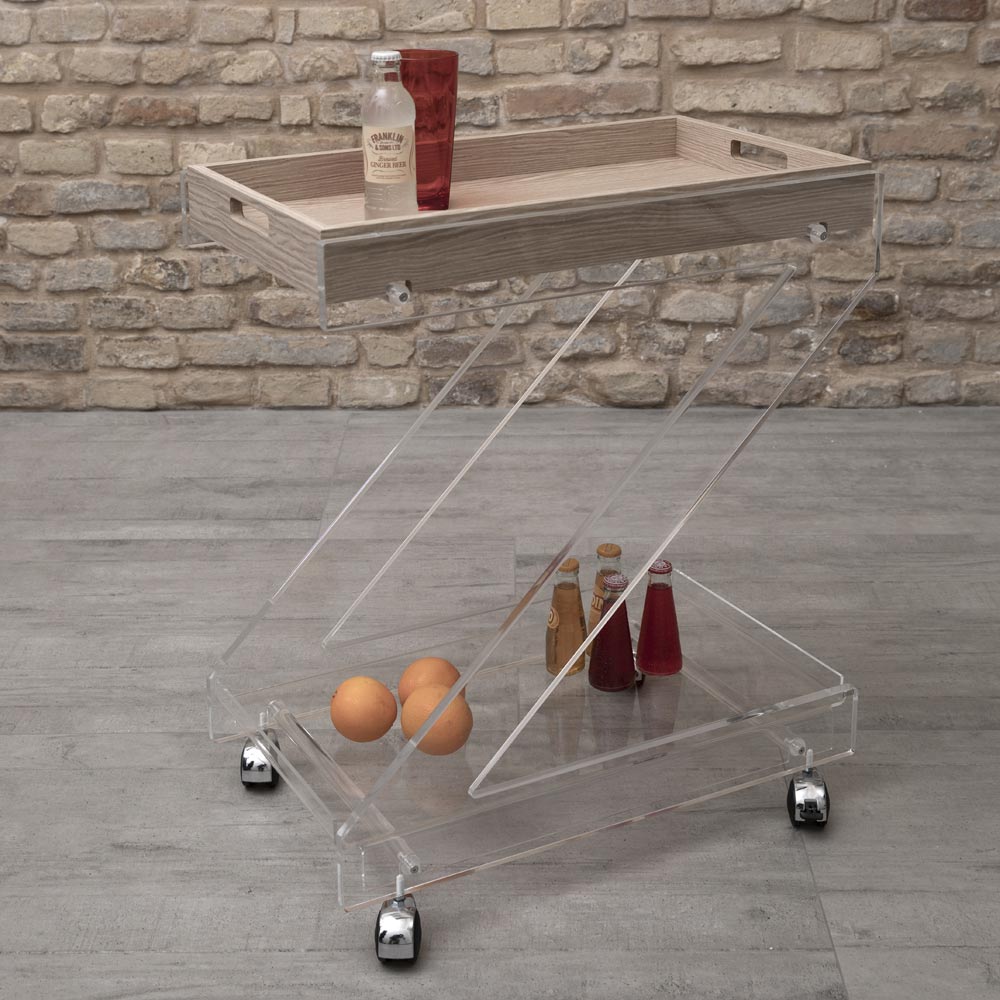 Kjo karrocë për dhomën e ndenjes është bërë tërësisht prej xhami akrilik transparent20 mm të trashë me një tabaka të lëvizshme dhe rrota rrotulluese. Përveç të qenit një complemento mobilje elegante dhe funksionale kjo është gjithashtu një objekt i shumë i zhdërvjellët dhe hapësirë për të shpëtuar të projektimit. Kristali akrilik është polimeri metakrilat që karakterizohet nga pastërtia e transparencës së tij që tejkalon kristalin natyror.