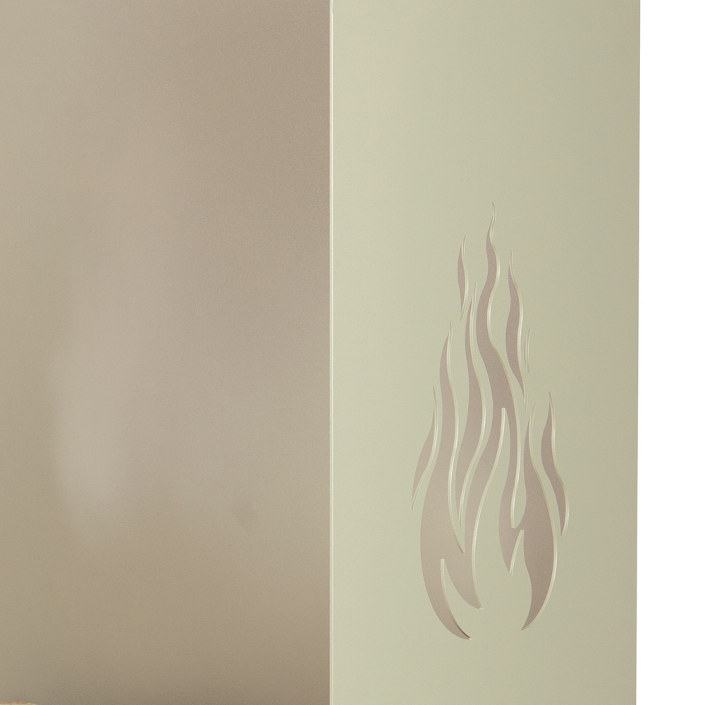 Kjo mbajtëse metalike për trungje është një kombinim perfekt i estetikës dhe praktikës , një objekt i domosdoshëm për dashamirësit e oxhakut tradicional. Dizajni është modern dhe i fortë , me motive flakësh në të dyja anët, të cilat jo vetëm e zbukurojnë pjesën, por gjithashtu ju lejojnë të shihni drurin e ruajtur brenda, duke sugjeruar menjëherë qëllimin e tij.