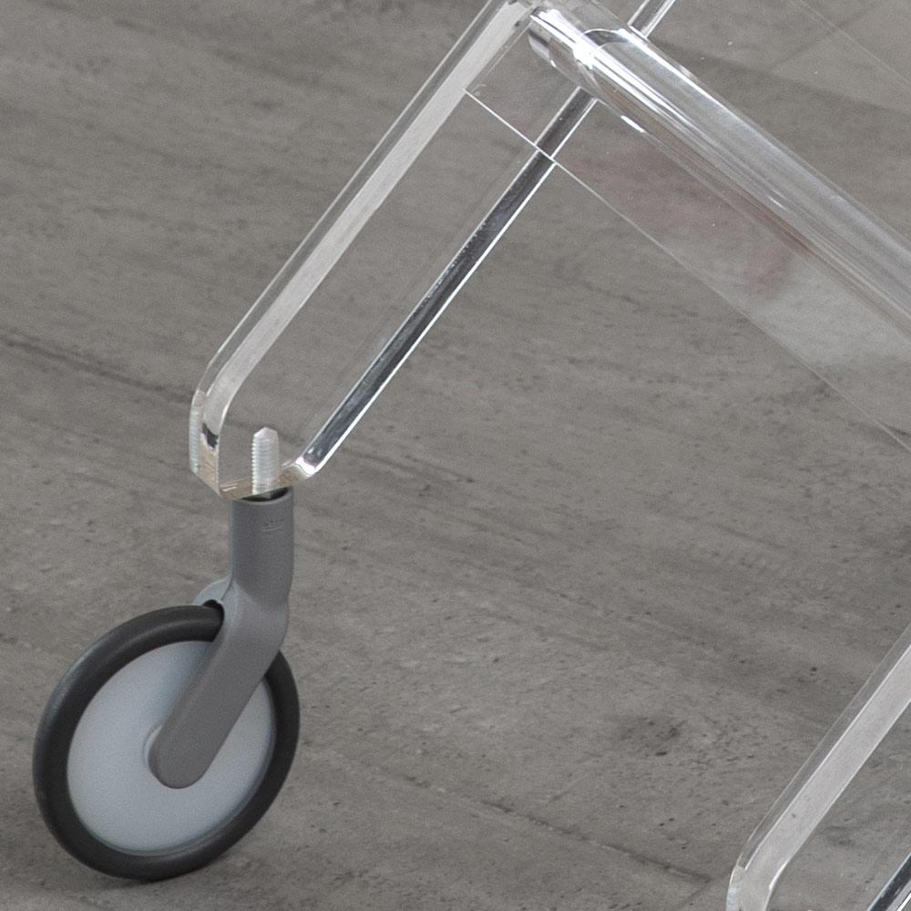 Kjo karrocë e dhomës së ndenjes është tërësisht e bërë nga kristali akrilik i pastër me trashësi 20 mm. Dizajni përbëhet nga 2 tabaka të lëvizshme, dorezëalumini të lëmuar dhe rrota rrotulluese. Përveç të qenit një complemento mobilje elegante dhe funksionale kjo është gjithashtu një objekt i shumë i zhdërvjellët dhe hapësirë për të shpëtuar të projektimit. Kristali akrilik është polimeri metakrilat që karakterizohet nga pastërtia e transparencës së tij që tejkalon kristalin natyror.