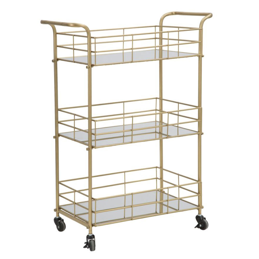 Karrocë ushqimi me strukturë prej ari të përfunduar prej ari dhe 3 rafte pasqyre të kompletuar me rrota. Një dizajn i thjeshtë,elegant dhe funksional ideal për zonat shtëpiake siç janë dhomat e ngrënies ose kuzhinat moderne ku është praktike dhe e dobishme dhe në të njëjtën kohë e përsosur për kompletimin e mobiljeve me një prekje kapriçioze dhe magjepsëse .
