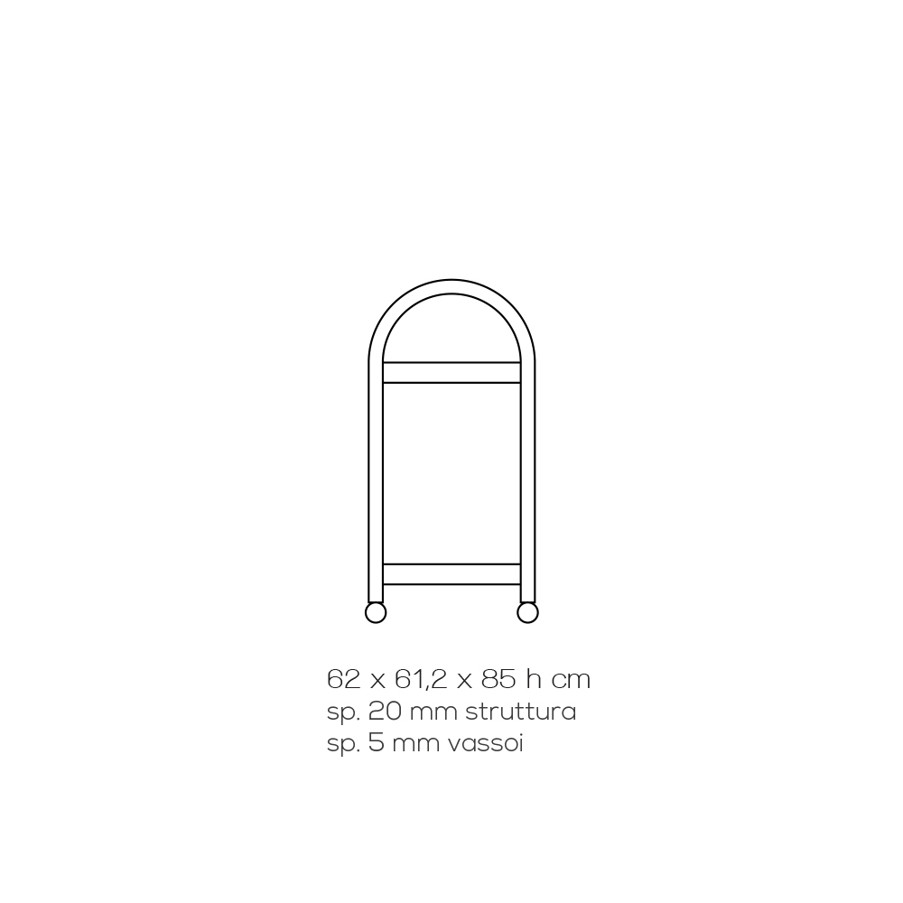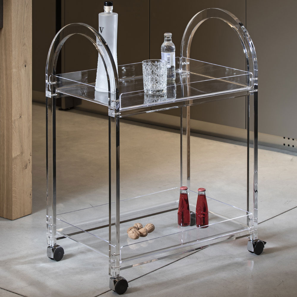 Kjo karrocë e dhomës së ndenjes është tërësisht e bërë nga kristali akrilik transparent metrashësi 20 mm me rrota të kthyeshme. Përveç kësaj për të qenë një complemento mobilje elegante është gjithashtu një objekt jashtëzakonisht funksionale e cila karakterizohet nga format hark anët e tray (5 mm trashë). Kristali akrilik është polimeri metakrilat që karakterizohet nga pastërtia e transparencës së tij që tejkalon kristalin natyror.