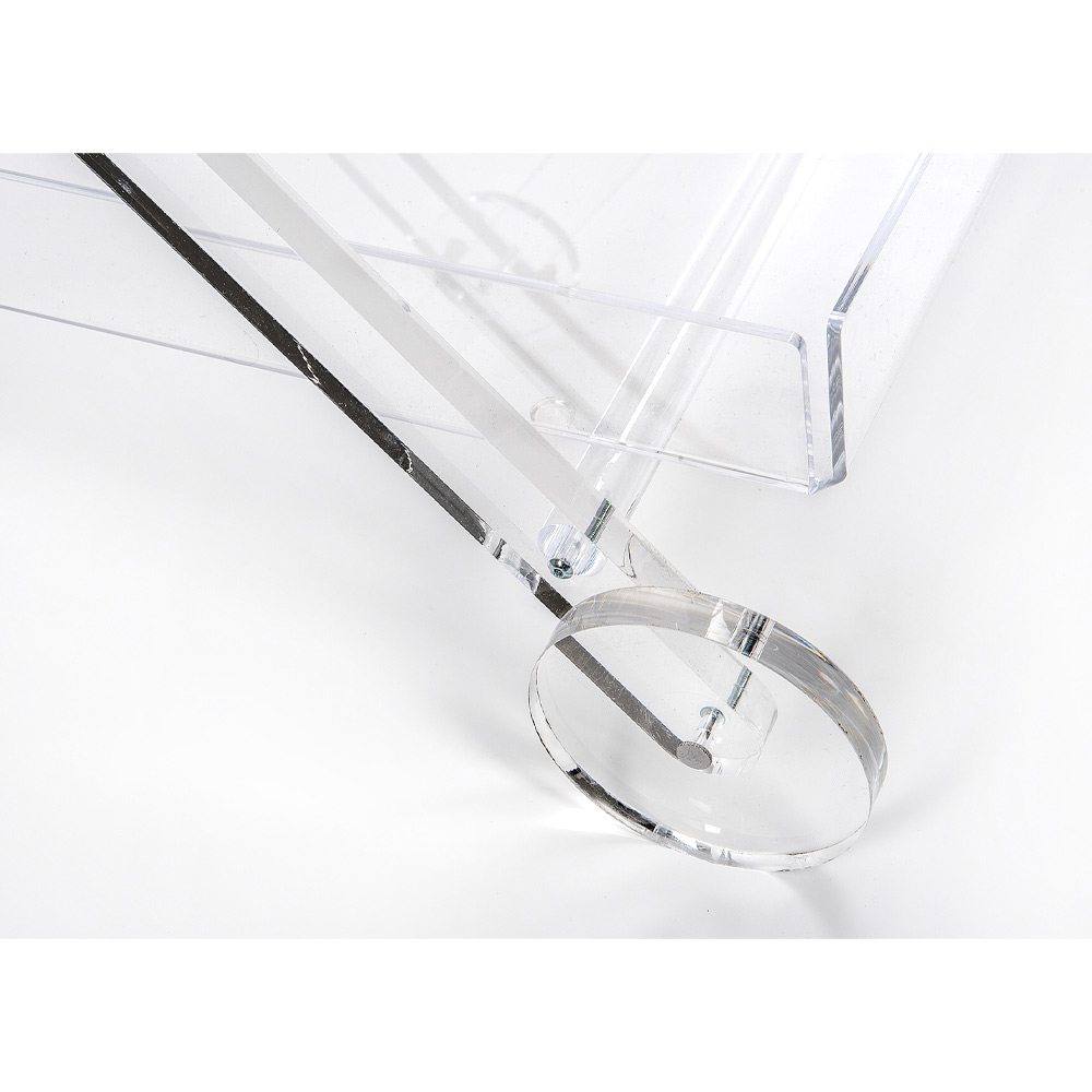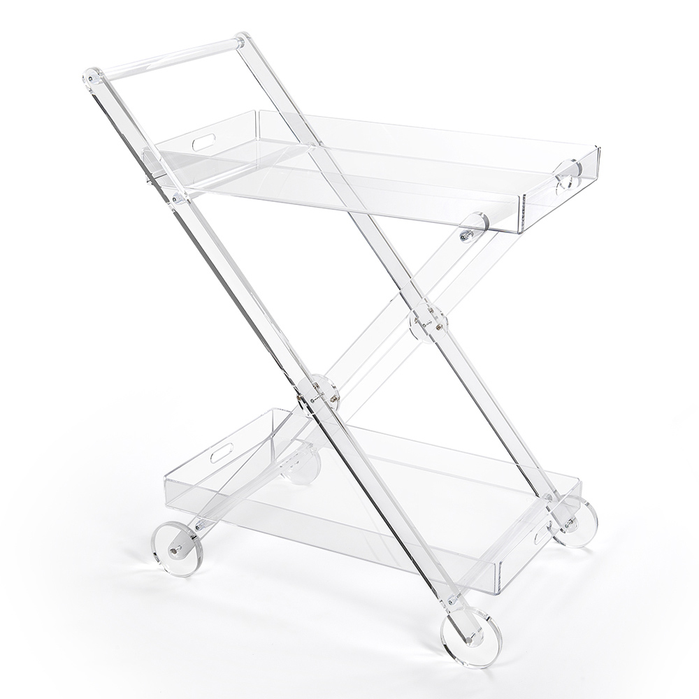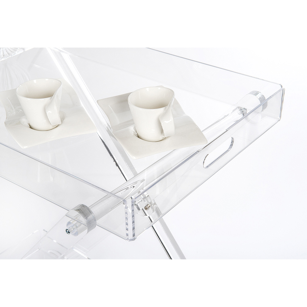 Karrocë praktike dhe të gjithanshëm ushqim, e bërë nga 100% PMMA pleksiglas nga polimer virgjër, ka një dizajn modern dhe linear, i përbërë nga 2 raftet që e bëjnë atë shumë të dobishme si një karrocë ndihmëse në mjedisin e shtëpisë. Një plotësues në të cilin estetika takon funksionalitetin.