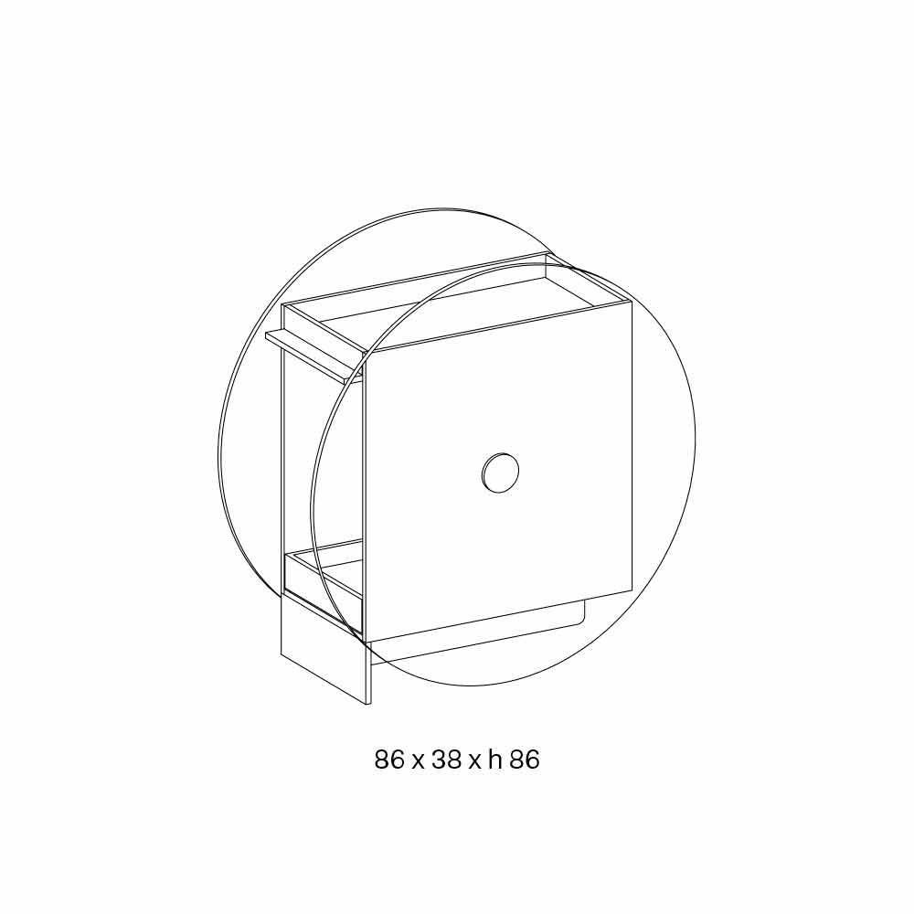 Bërë me një strukturë prej xhami të pastër dhe të pastër që ju lejon të shihni siluetën e objekteve të ruajtura në të, elementi i vërtetë mbajtës i ngarkesës, si dhe pjesa ikonike e pjesës përbëhet nga dy rrota të mëdha qelqi ekstra të pastra . Më në fund, një tabaka tërheqëse në dru të llakuar me të zezë mat plotëson modelin mjaft estetik dhe funksional.
