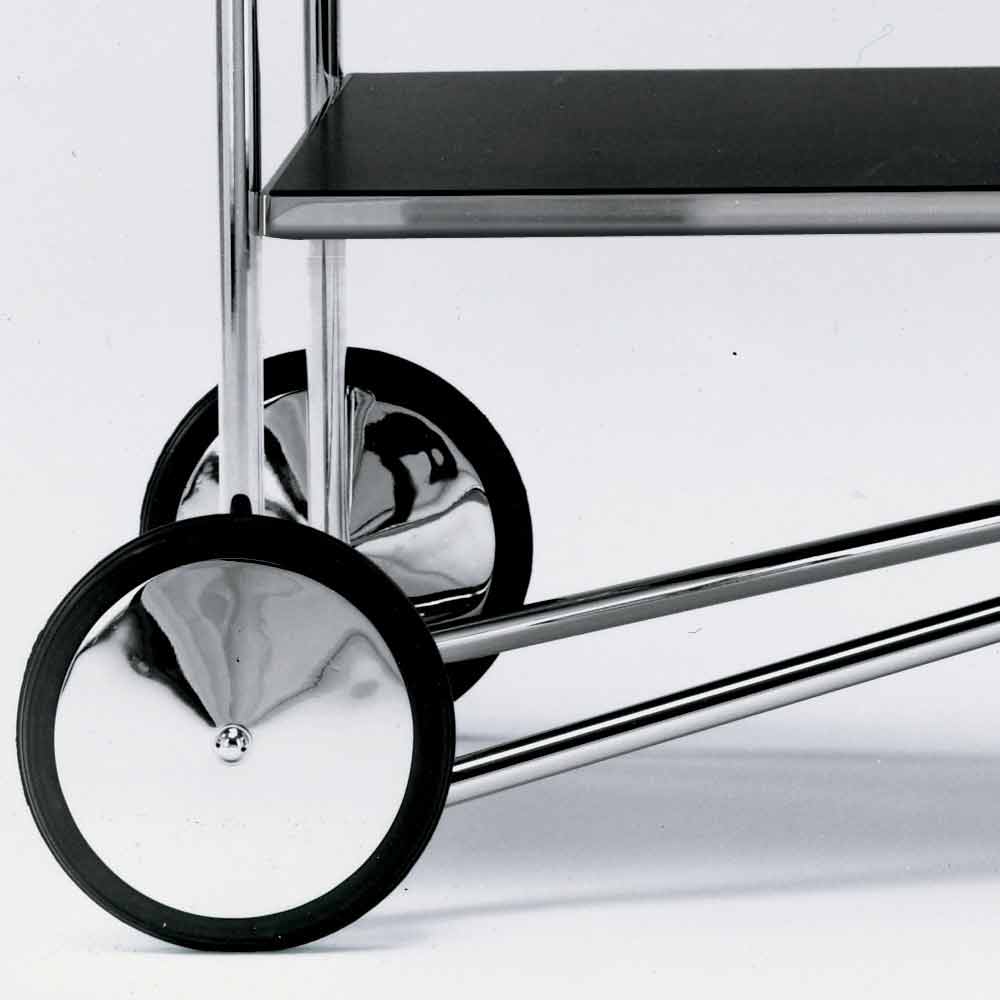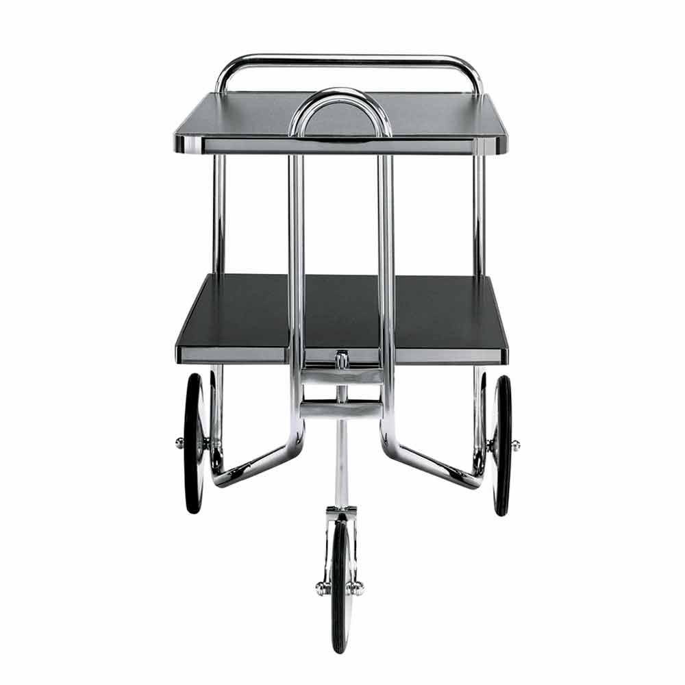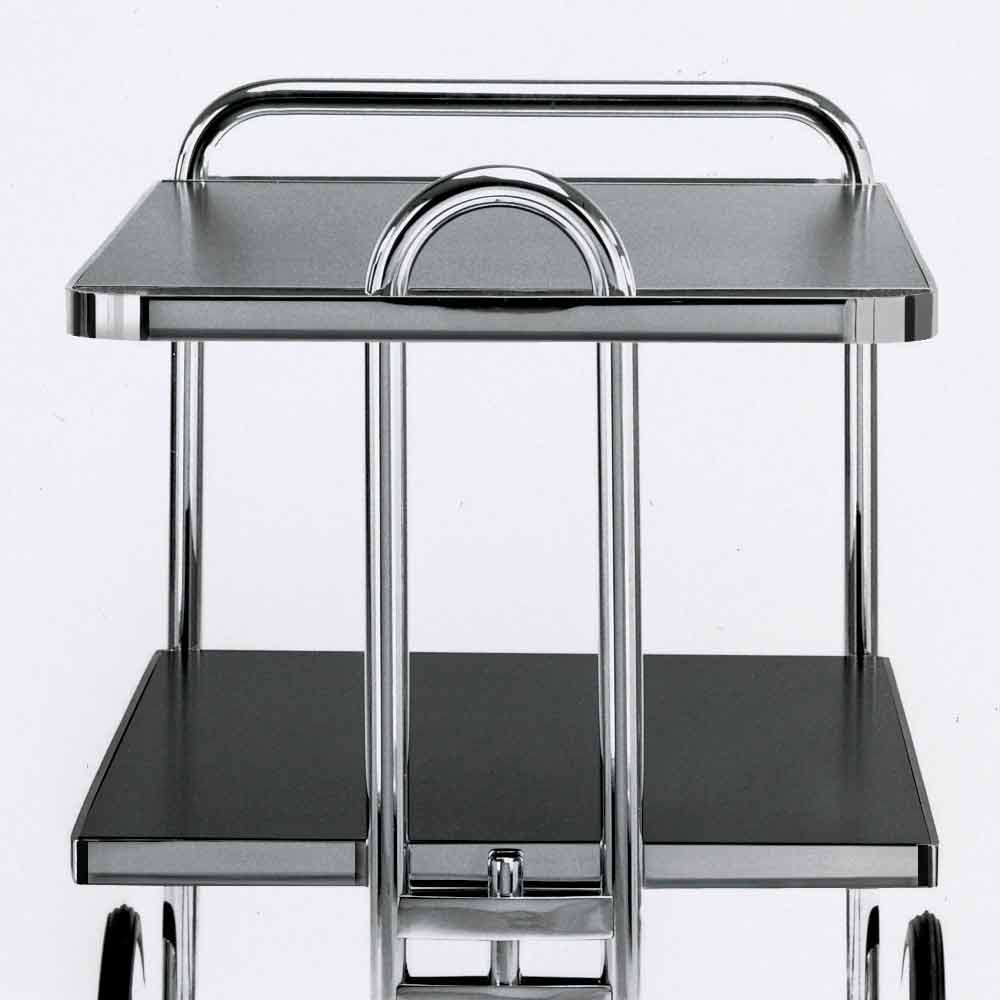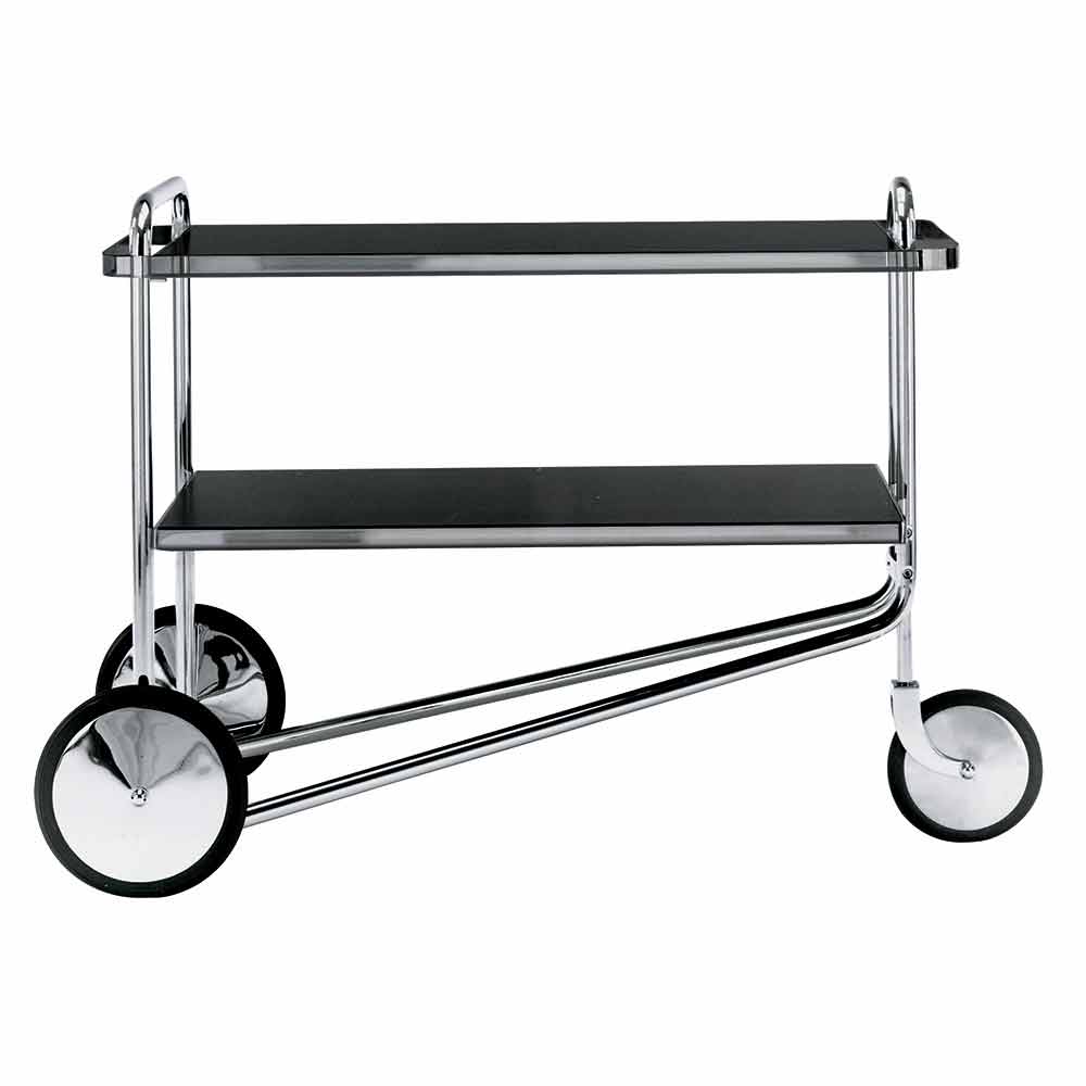 Karrocë ushqimore me strukturë çeliku të kromuar e pajisur me 3 rrota dhe dy rafte në petëzuar me ngjyrë të zezë. Prakticiteti dhe dizajni bashkohen për t'i dhënë jetë një mobilieje shumë funksionale dhe ndihmëse në mjedisin e shtëpisë, përdorimi i së cilës lehtësohet edhe më shumë nga rrotat praktike që lejojnë lëvizjen e saj të shpejtë dhe të lehtë. Përveç një anë thjesht funksionale, kjo karrocë ushqimore ofron një ideal estetik novator dhe të rafinuar për ata që duan të kompletojnë mobiljet e tyre me një prekje të stilit të ri .