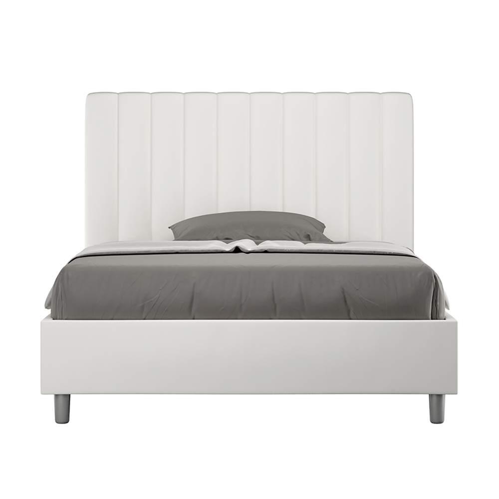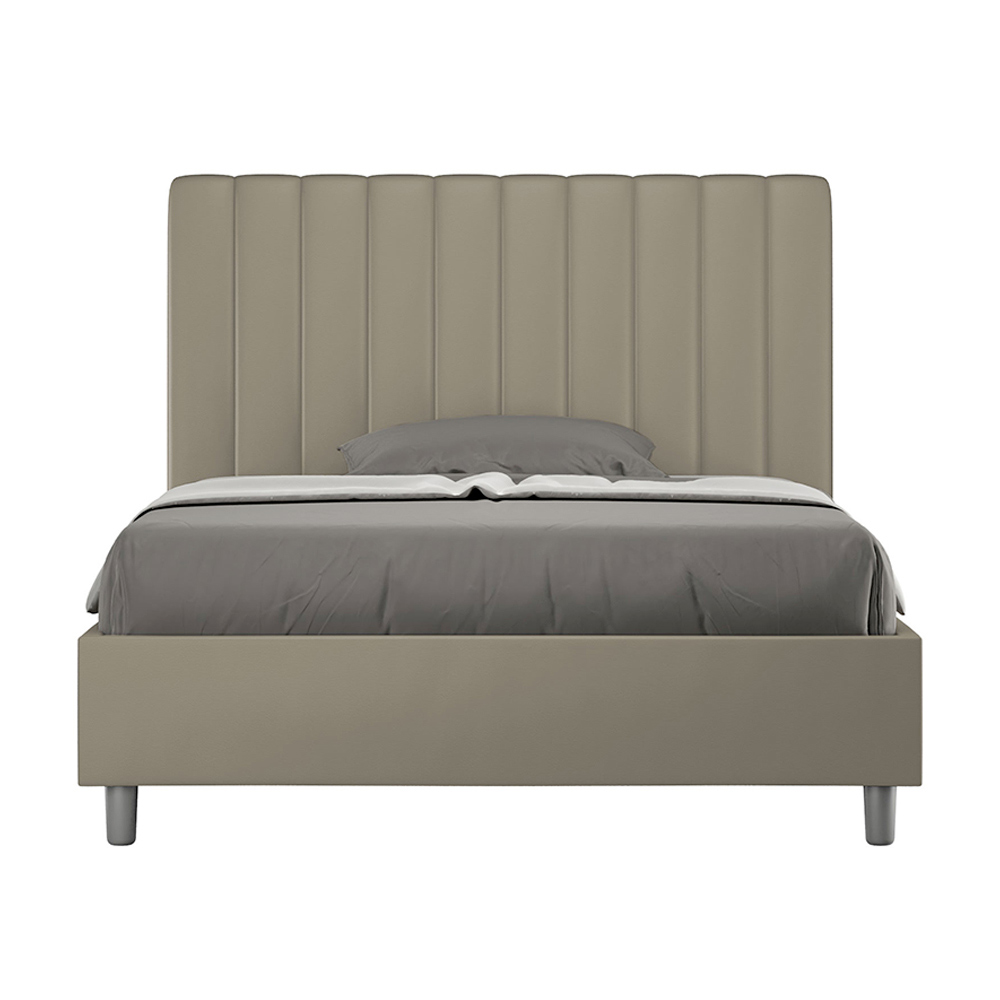 Krevat francez 140x200 cm, i mbushur me panele melamine dhe i mbuluar me lëkurë artificiale , i prodhuar tërësisht në Itali. Ky krevat francez me kornizë të veshur me tapiceri është ideal për ata që kërkojnë një element tërheqës pa qenë tepër arrogant. Ky krevat krenohet me një kokë minimaliste me një efekt delikat të mbushur me vija vertikale simetrike , të cilat përshtaten bukur në çdo ambient, qoftë modern apo klasik. Tapiceria prej lëkure artificiale i shton dhomës një ndjesi të ngrohtë dhe mikpritëse.
