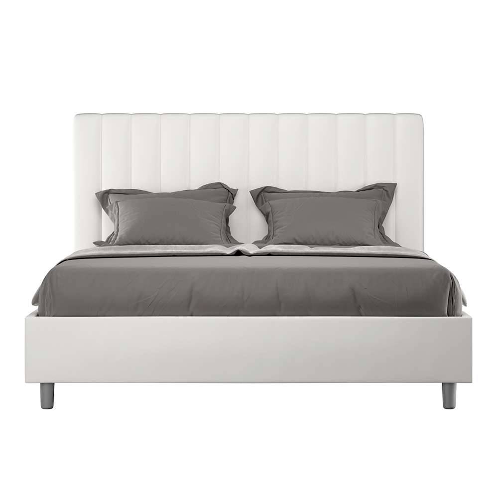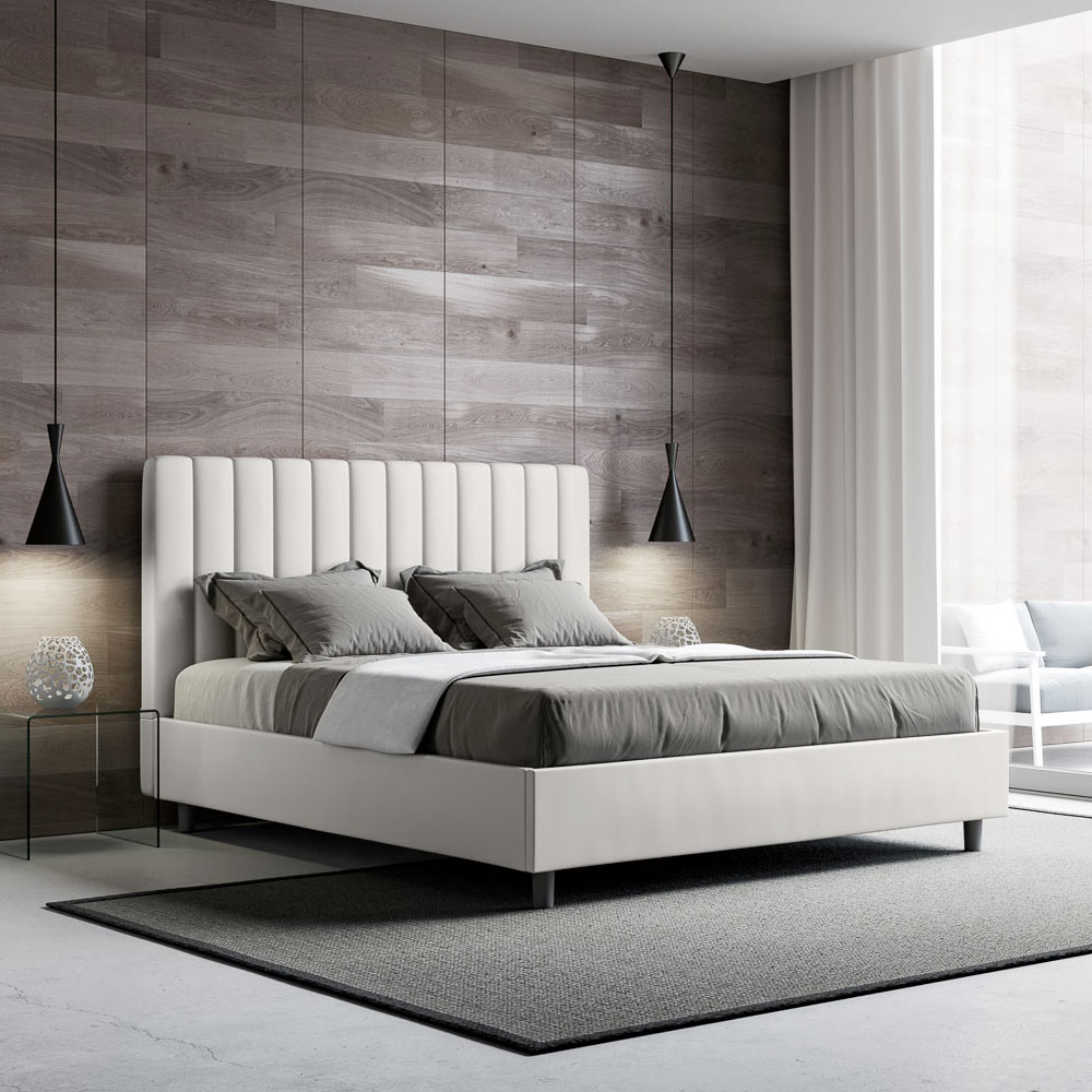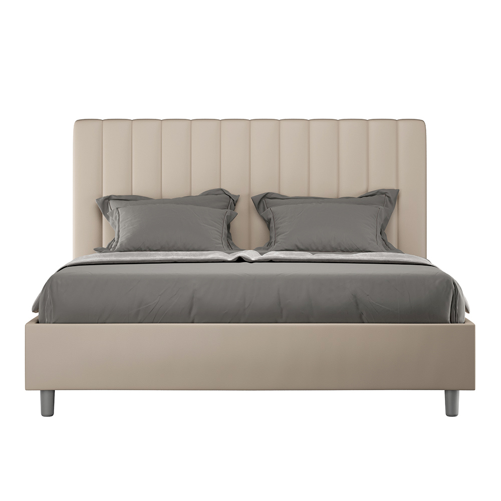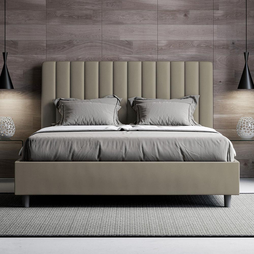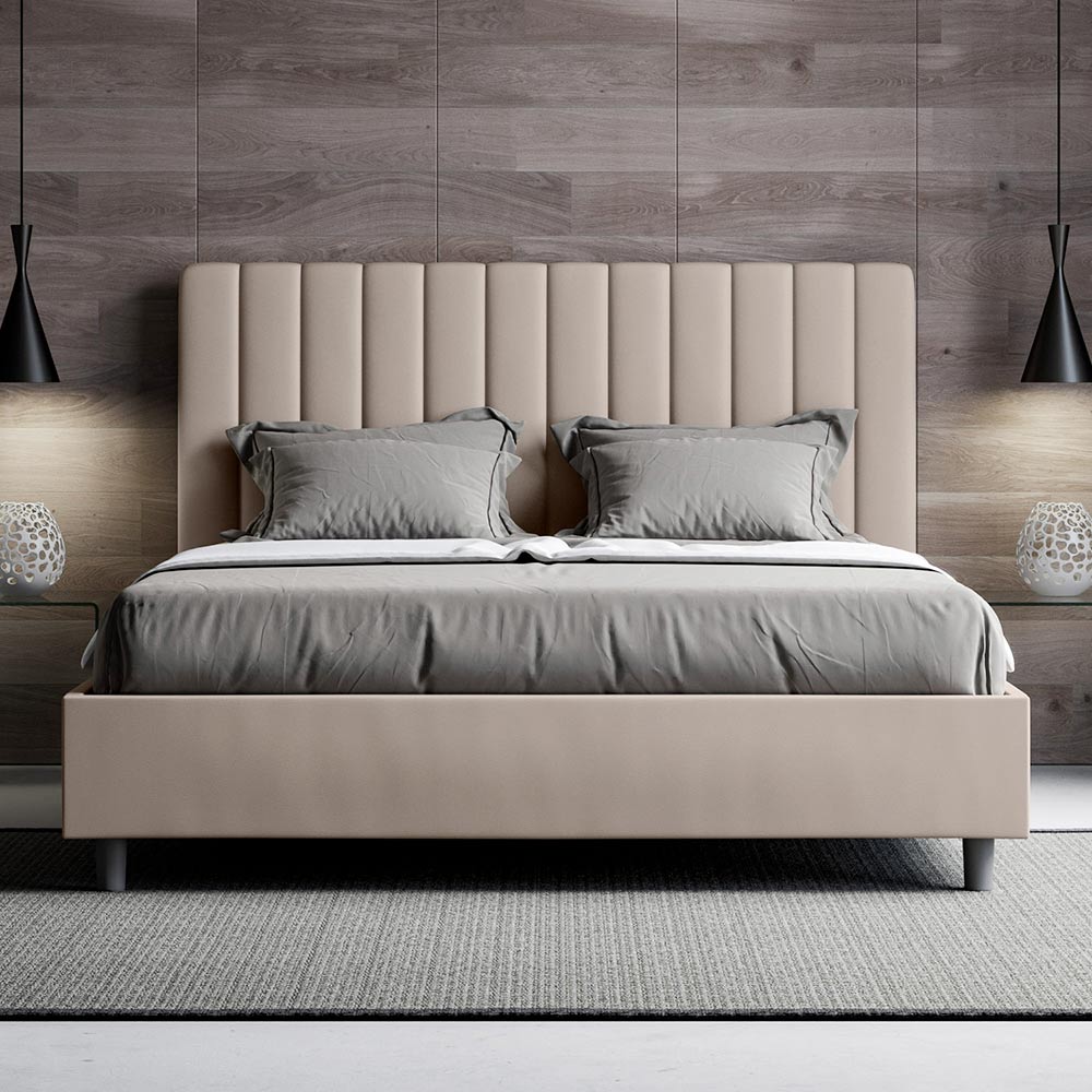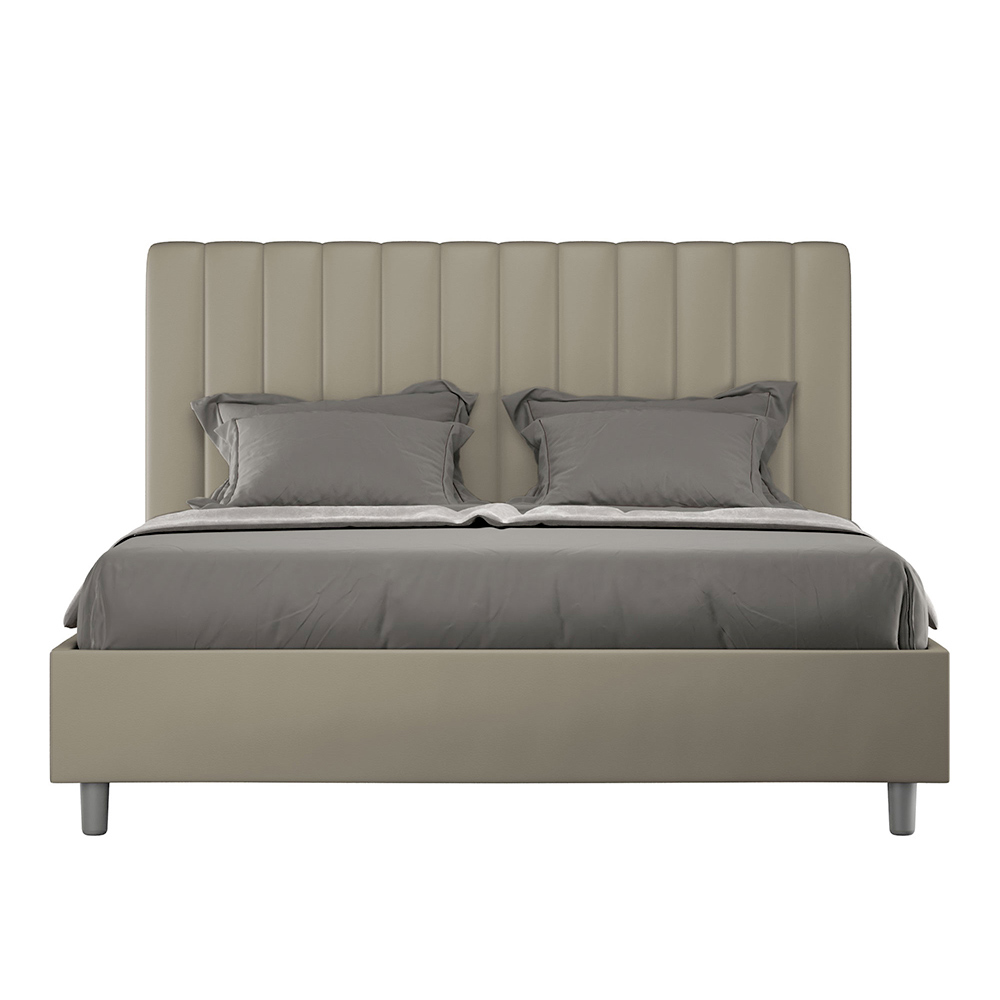 Krevat dopio i mbushur 160x200 cm i bërë nga panele kartoni dhe i mbuluar me lëkurë imituese , i prodhuar tërësisht në Itali. Ky krevat dopio me kornizë të veshur me tapiceri është ideal për ata që kërkojnë një element tërheqës pa qenë tepër arrogant. Ky krevat krenohet me një kokë koke minimaliste me një efekt delikat të mbushur me vija vertikale simetrike , i cili përshtatet bukur në çdo ambient, qoftë modern apo klasik. Tapiceria prej lëkure artificiale i shton dhomës një ndjesi të ngrohtë dhe mikpritëse. Është veçanërisht i përshtatshëm për hapësira të ndriçuara mirë, pasi materiali ruan ngjyrën e tij edhe pas ekspozimit të zgjatur në rrezet e diellit.