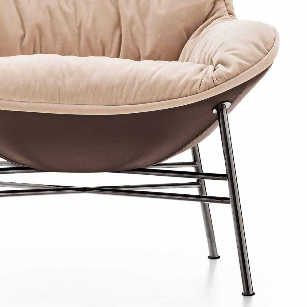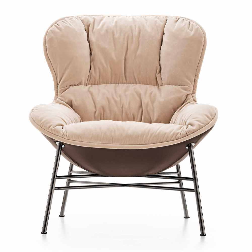 Kolltuk origjinal i dhomës së ndenjes i prodhuar në Italime strukturë metalike të kromit të zi, guaskë pëlhure të mbushur me tegeladhe tapiceri të jashtme lëkure. Predha është e mbushur me patë të vërteta dhe fibra poliesteri ndërsa jastëku i sediljes është i mbushur me shkumë poliuretani jo-deformues (densiteti 30 kg / m³) duke arritur kështu të ofrojë një vend jashtëzakonisht mikpritës dhe të rehatshëm. Jorgani i pasëm dhe jastëku i sediljes në pëlhurë të lëvizshme, guaska e jashtme në lëkurë jo e lëvizshme. Karakterizuar nga një ndikim i fortë vizual, kjo kolltuk arrin të shprehë qëndrueshmëri dhe rezistencë dhe në të njëjtën kohë rehati dhe butësi, duke përfaqësuar kështu një zgjidhje ideale për ata që kërkojnë një ide që mund të ndërthurë funksionalitetin dhe modelin . Kontrasti i mrekullueshëm midis prekjes së cilësisë së mirë të lëkurës dhe metalit dhe origjinalitetit të mbushjes bujare krijon një lojë të ndjesive materiale të afta për të pasuruar produktin me elegancë dhe personalitet, duke kompletuar kështu orenditë përreth në një mënyrë unike.