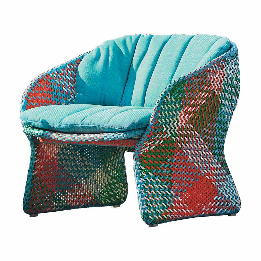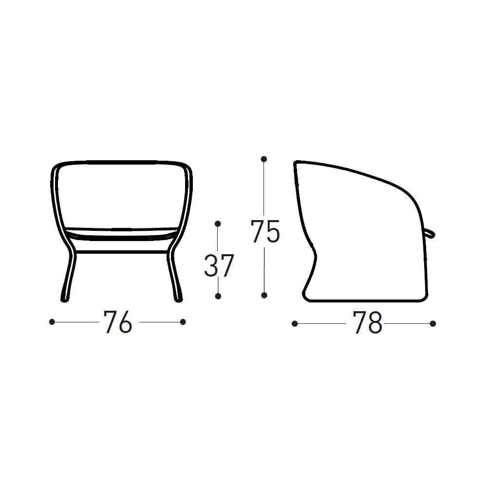 Kolltuk kopsht me cilësi të lartë në fibra sintetike të endura, kornizë alumini të pikturuar dhe jastëk në pëlhurë të mbushur.