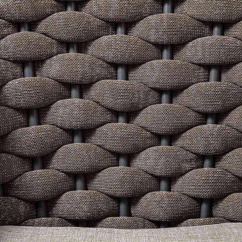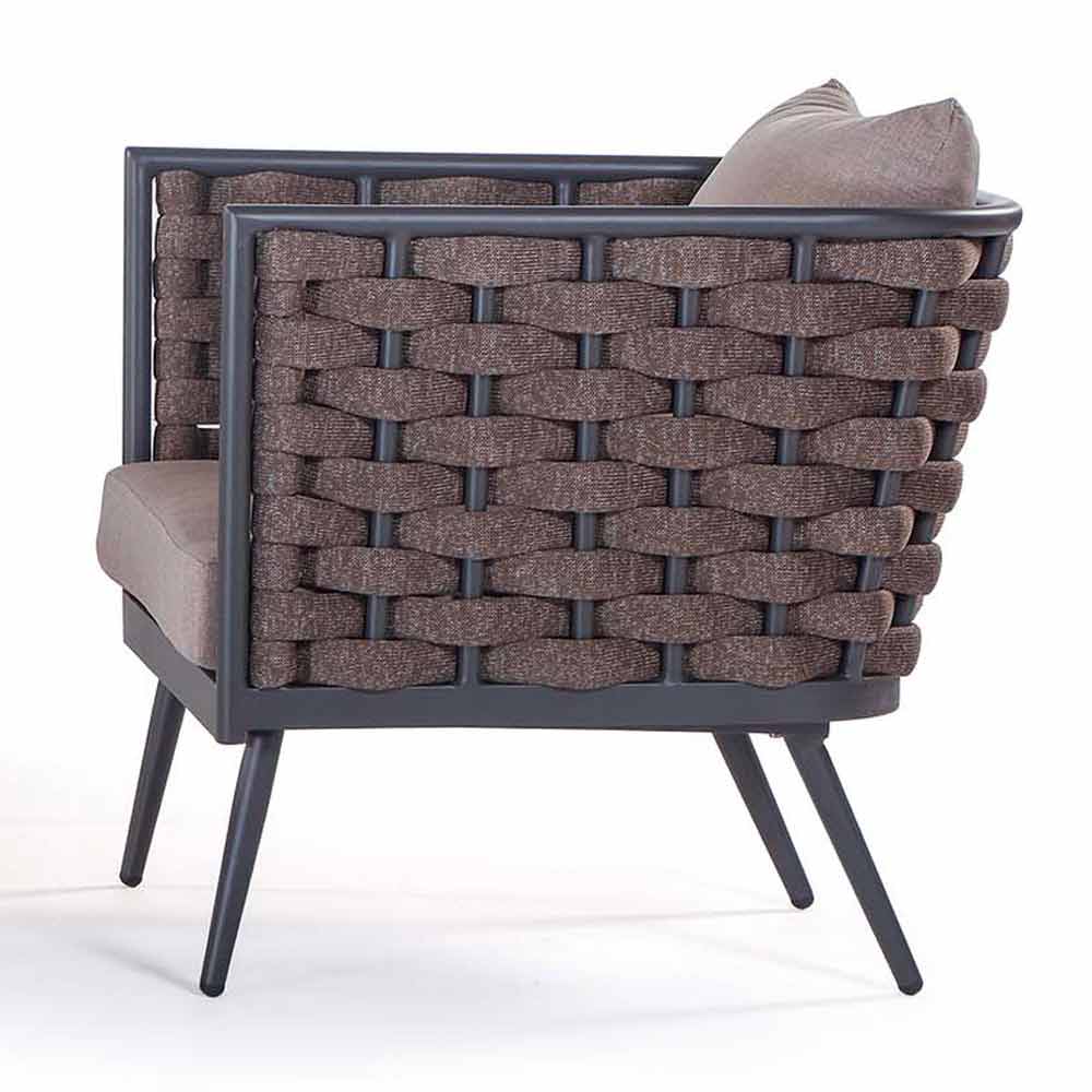 Kolltuk i jashtëm i bërë me strukturë alumini të lyer me grafit dhe endje litari poliestër të plotë me jastekë vendesh dhe shpine të mbuluara me pëlhurë akrilike kafe . Një sedilje për ambiente të jashtme që ndërthur funksionalitetin dhe një pamje të këndshme estetike, duke arritur kështu të ofrojë një zgjidhje perfekte mobilimi për ata që kërkojnë një produkt sa më të rehatshëm dhe mikpritës, aq edhe elegant dhe të aftë për të krijuar një harmoni të mrekullueshme me elementët e tjerë të mobiljet përreth.