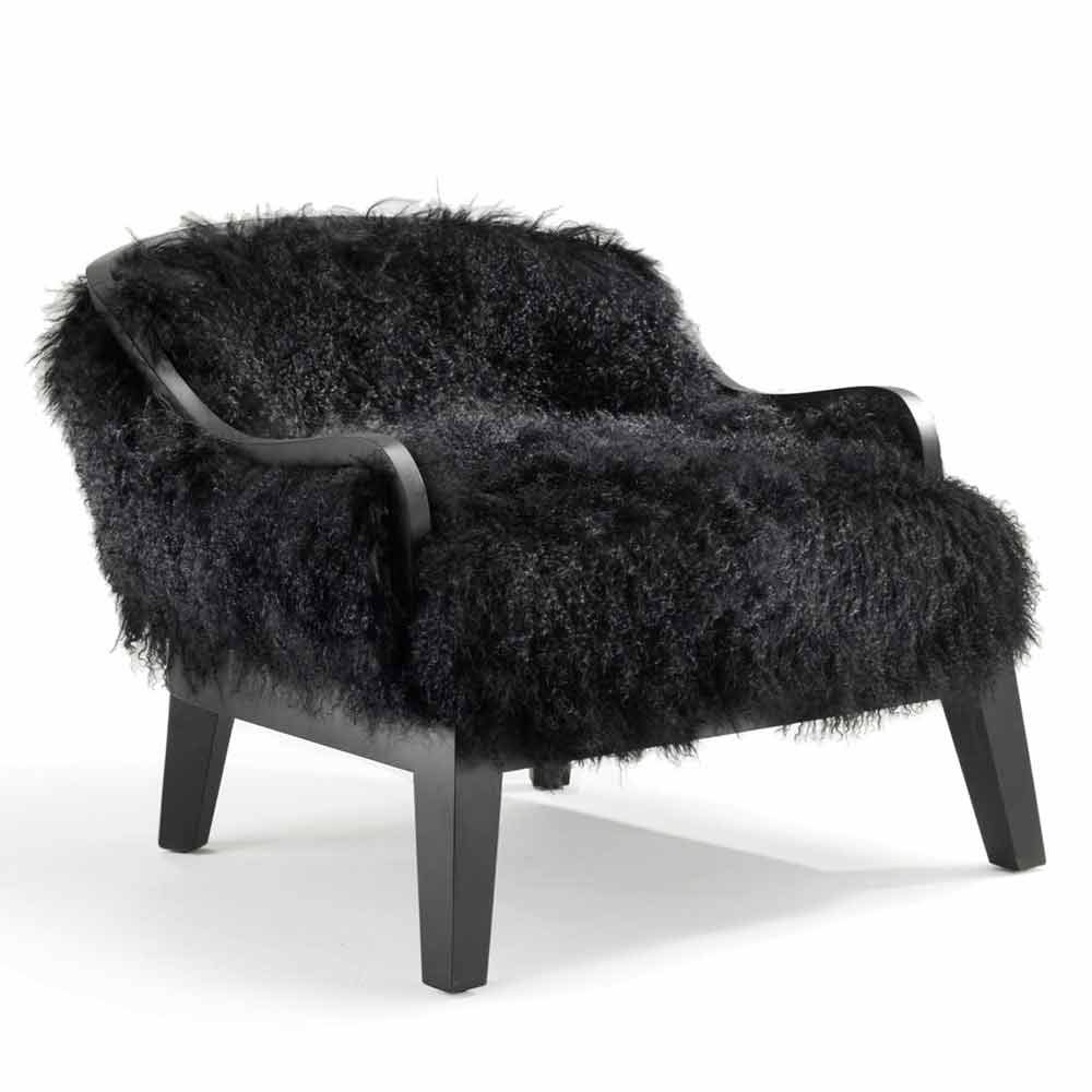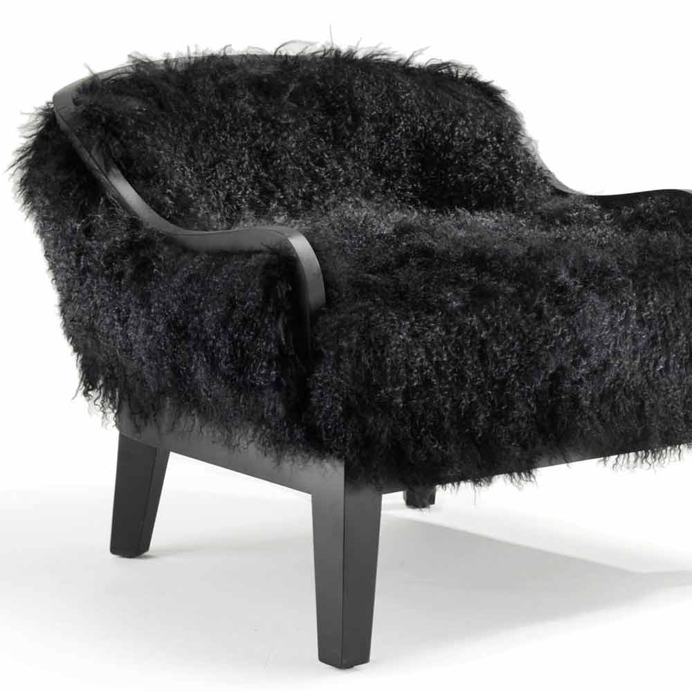 Kolltuk i ulët në lëkurë dhe lesh të zi, të bërë në Itali, Eli Kolltuk i ulet. Retro e mbuluar në lëkurë. Selia e përparme dhe e pasme e mbuluar me flokë qengji të zezë me tibet. Kornizë druri dhe baza. Përfundoni në lisin e zi.