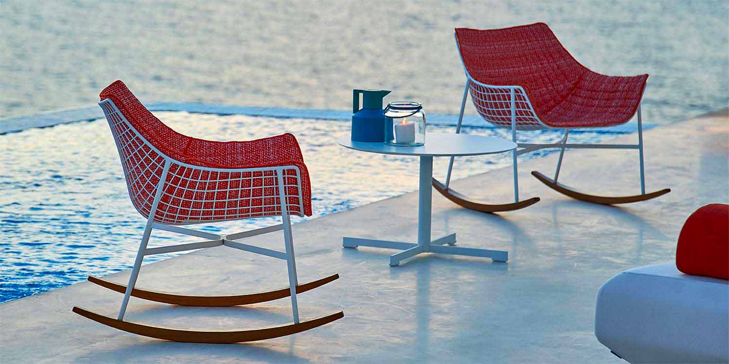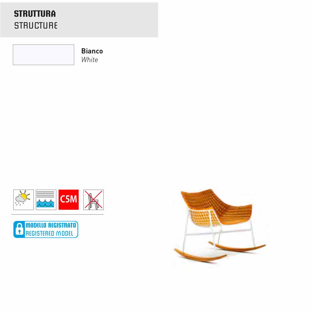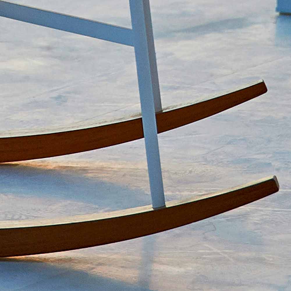 Summer Set është një karrige bukuroshe në natyrë lëkundëse, e karakterizuar nga një strukturë që mbart ngarkesë në çelik të bardhë të veshur me pluhur dhe rrëshqet në dru natyral të fortë Iroko.