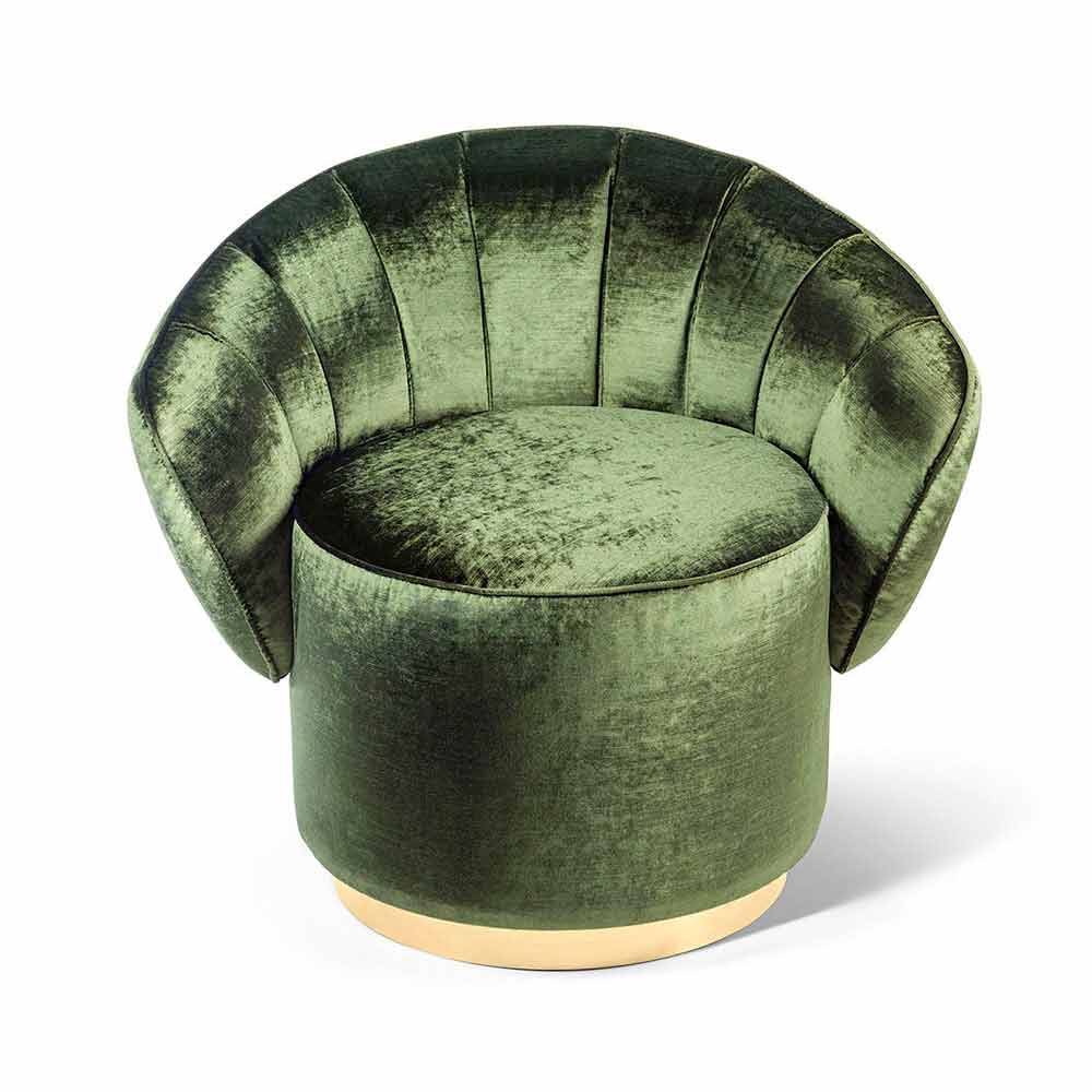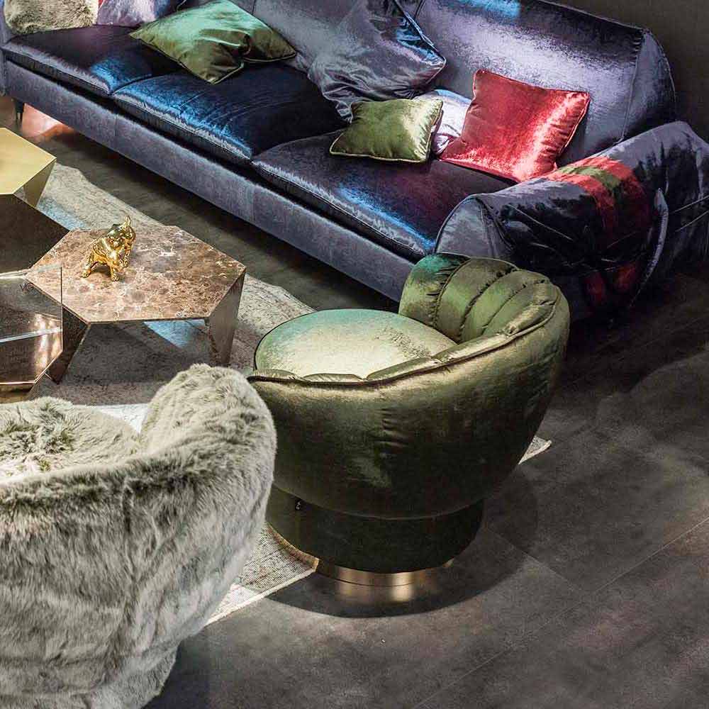 Kolltuk pëlhure të veshur me susta Belle, dizajn modern. Kolltuk dizajni i krijuar nga stilisti Giorgio Ragazzini. Karakterizohet nga një stil deco frymëzuar nga Belle Époque dhe nga shpirti bohem i lindur në Francë në fund të shekullit XIX.