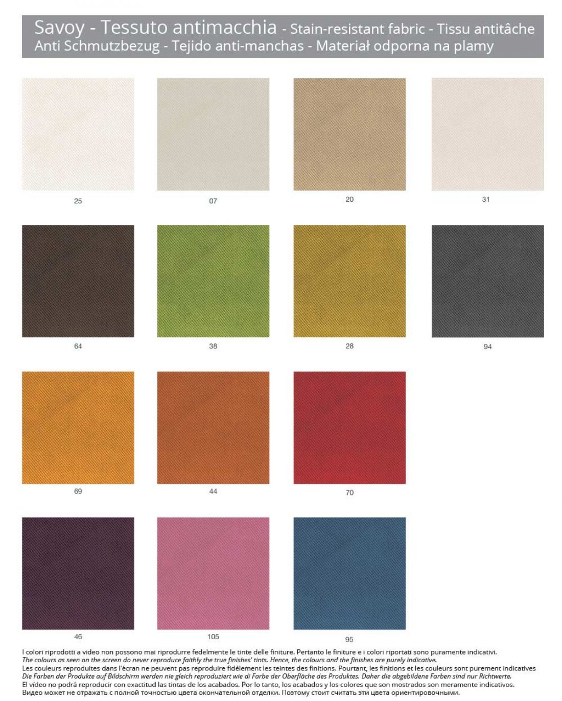 - Pëlhurë rezistente ndaj njollave të Savojës ; Savoja është një pëlhurë me dizajn modern, e këndshme në prekje dhe shumë rezistente ndaj konsumimit dhe konsumimit. Karakteristika kryesore e kësaj pëlhure është papërshkueshmëria e saj totale ndaj ujit: është në fakt gatantito si "ilaç kundër ujit". 89% poliester, 8% poliamide, 2% pambuk, 1% viskoze.