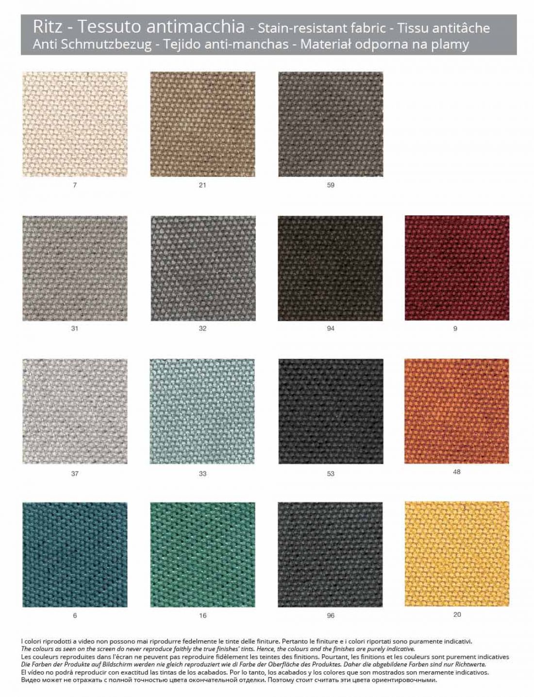 - Pëlhurë anti-njollë Ritz ; Ritz është një pëlhurë e këndshme në prekje, e zgjedhur si mbulesë për këto sedilje falë rezistencës së saj karakteristike ndaj konsumit. Isshtë një pëlhurë kundër njollave e përbërë nga 86% Poliester, 14% Poliamide. Pesha / trashësia 490 gr / mtl.
