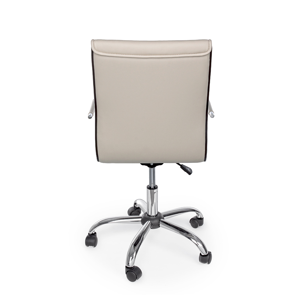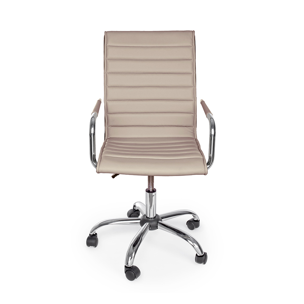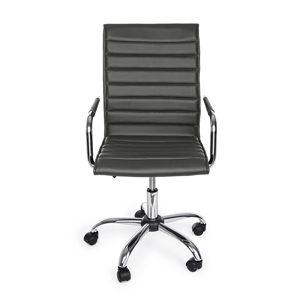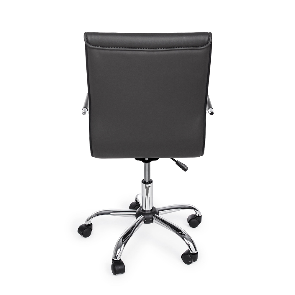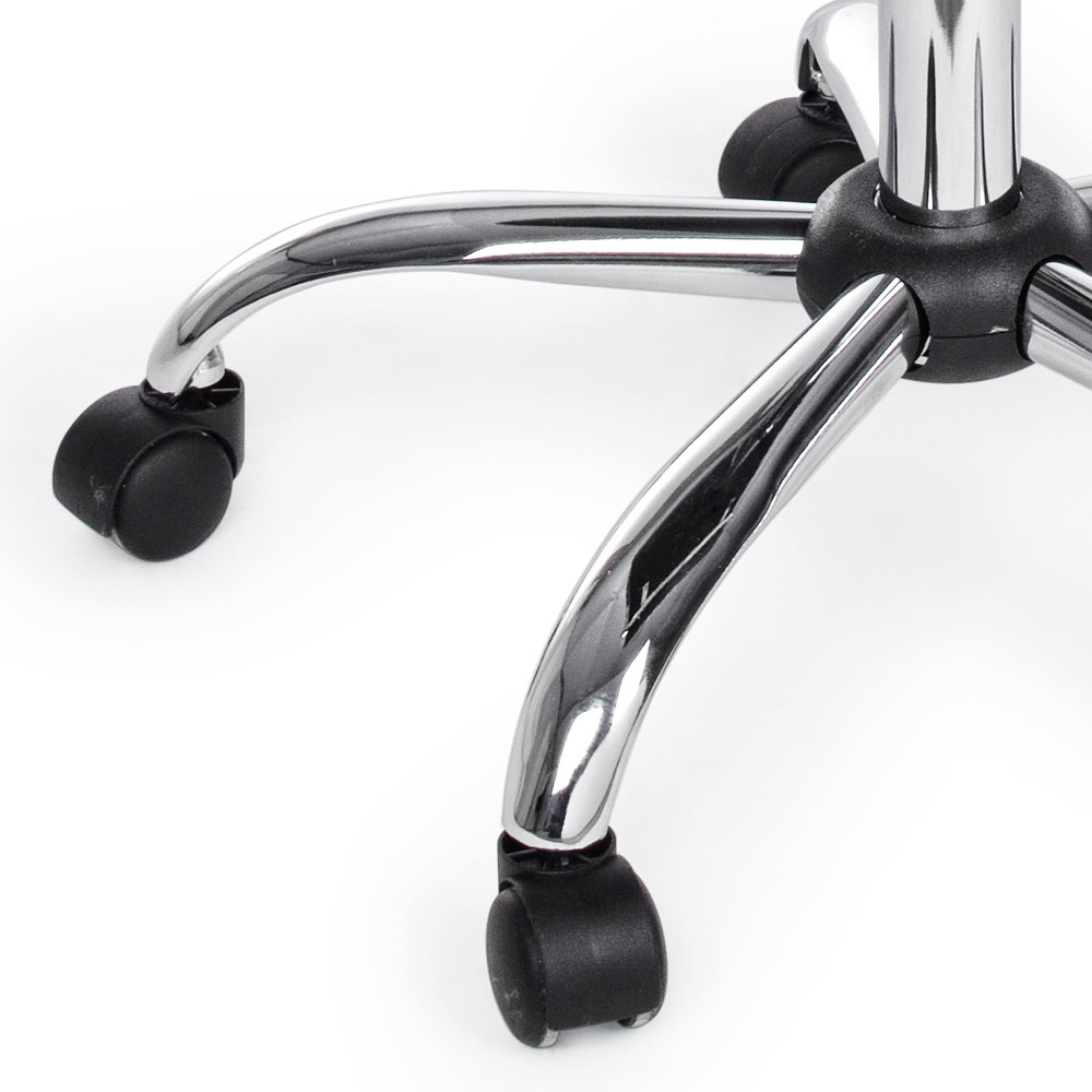 Ky kolltuk zyre është bërë me bazë solide prej çeliku të kromuar me diametër 56 cm dhe rrota najloni . Sedilja dhe mbështetësja e rregullueshme në lartësi janë të mbushura dhe të mbuluara me lëkurë imituese . Mbështetësit e krahëve prej çeliku të kromuar përmbajnë një tapiceri prej lëkure për elegancën më të madhe. Dizajn për t'u mbledhur.