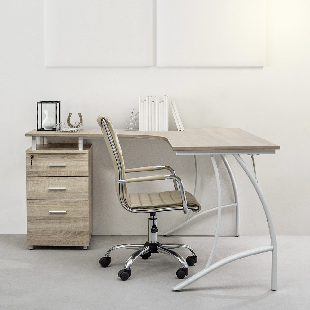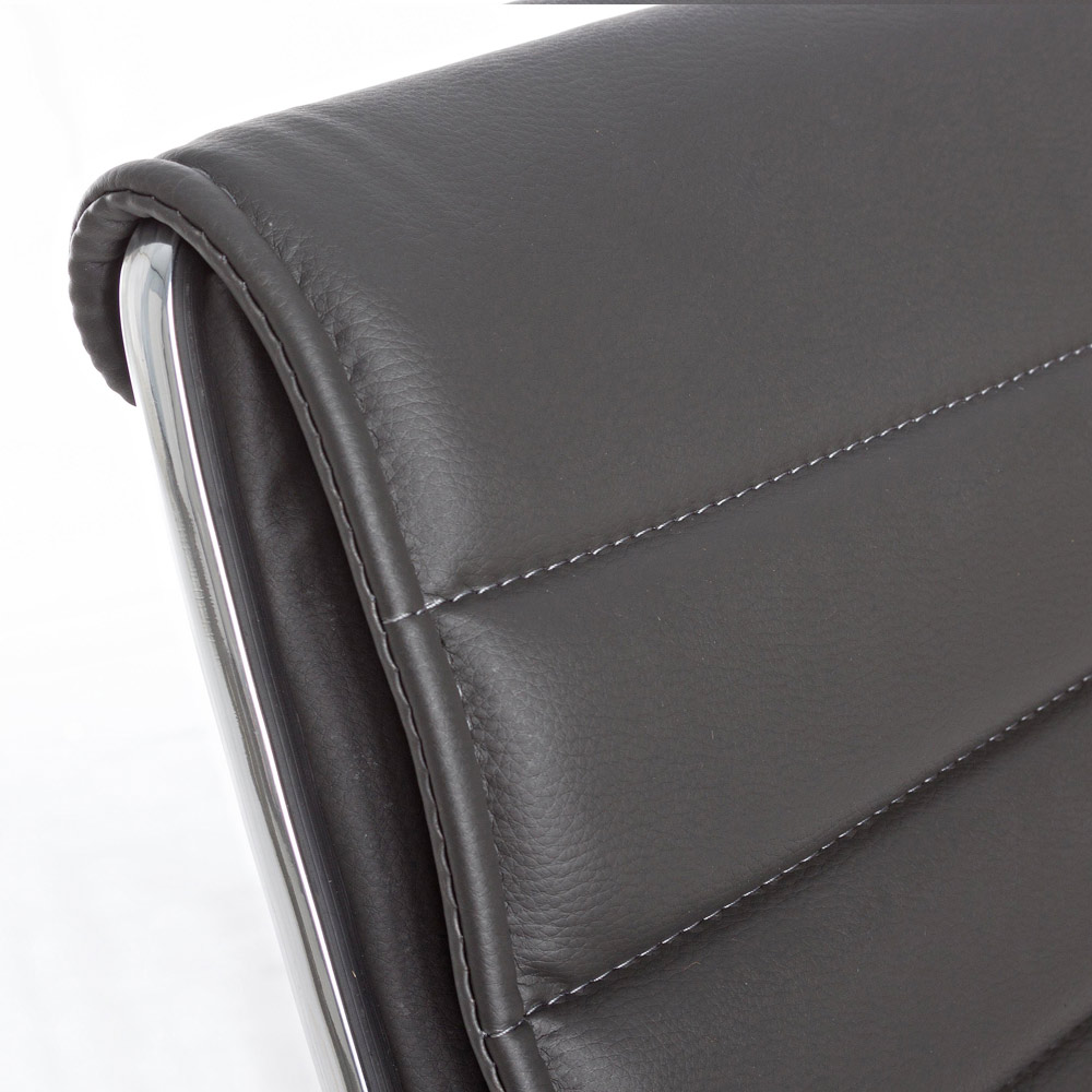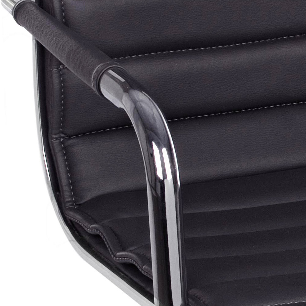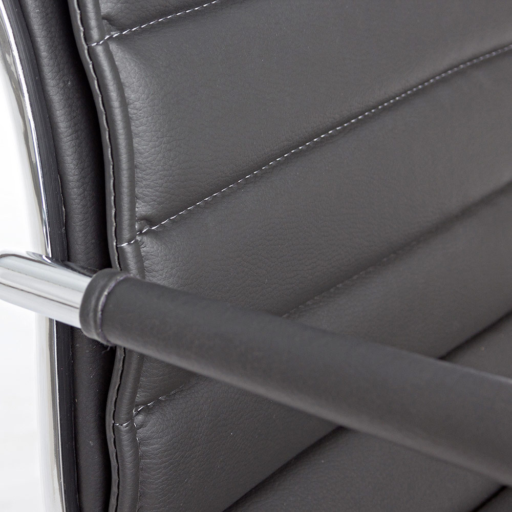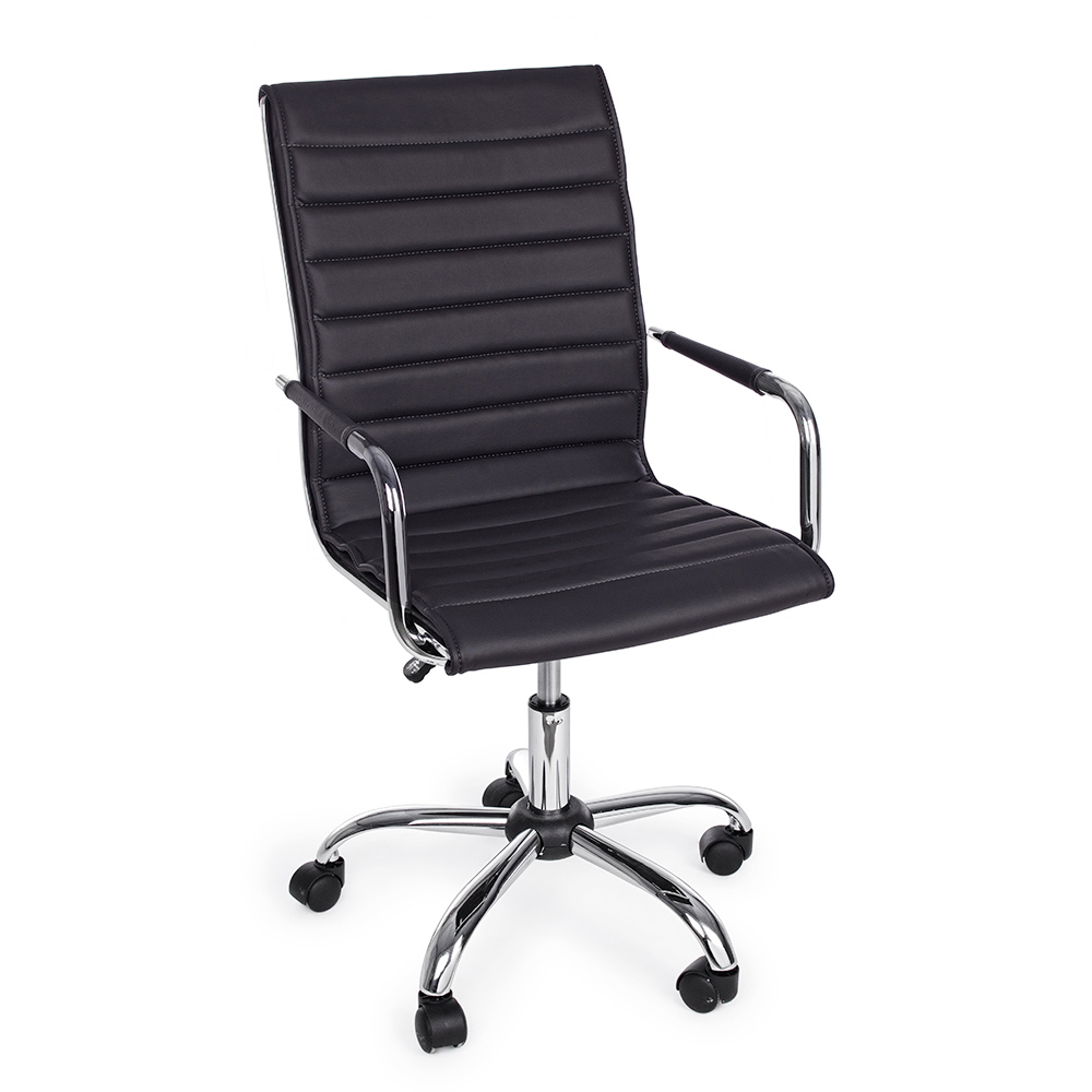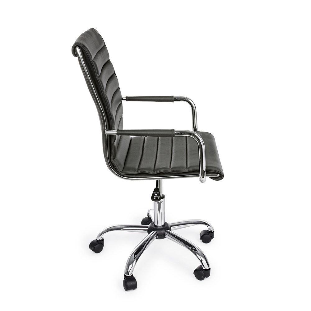 Ky kolltuk zyre është bërë me bazë solide prej çeliku të kromuar me diametër 56 cm dhe rrota najloni . Sedilja dhe mbështetësja e rregullueshme në lartësi janë të mbushura dhe të mbuluara me lëkurë imituese . Mbështetësit e krahëve prej çeliku të kromuar përmbajnë një tapiceri prej lëkure për elegancën më të madhe. Dizajn për t'u mbledhur.