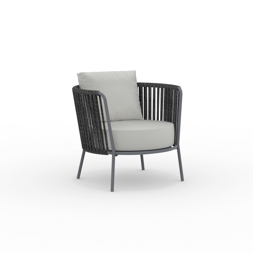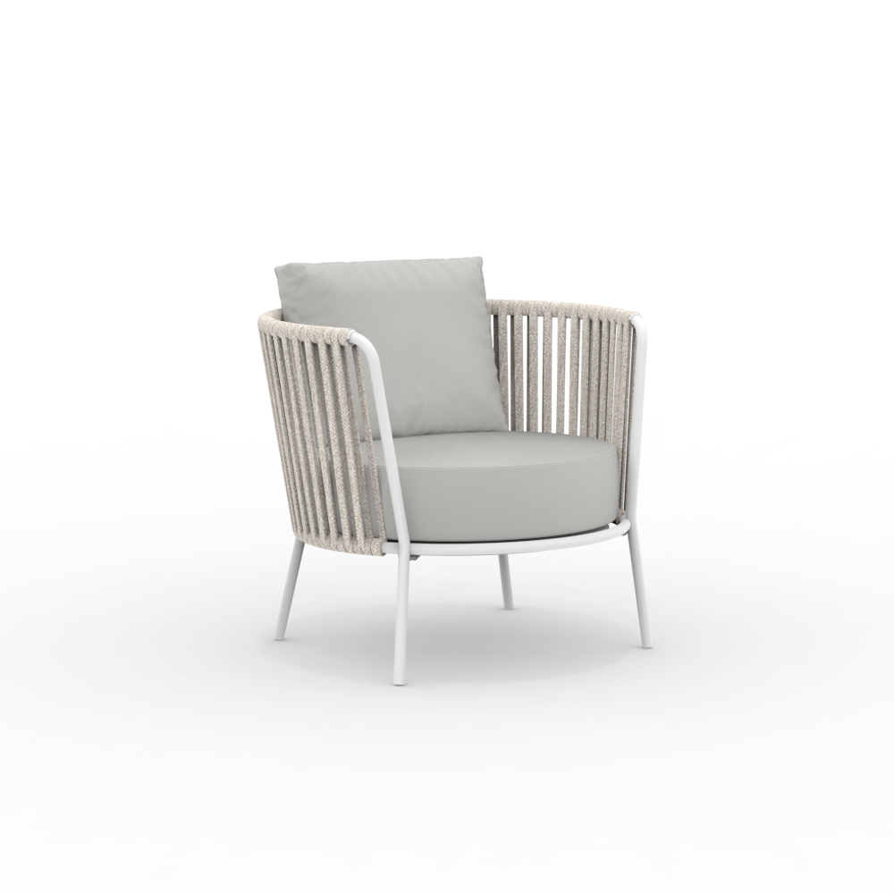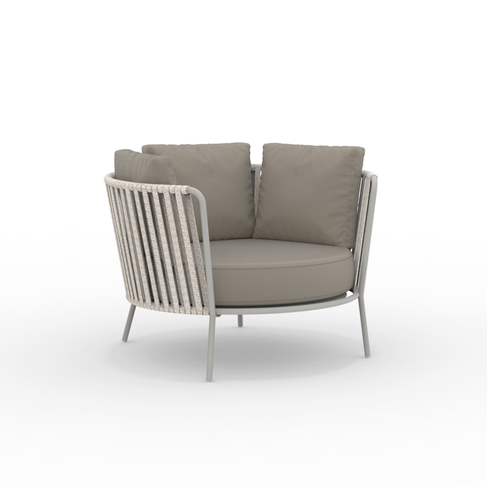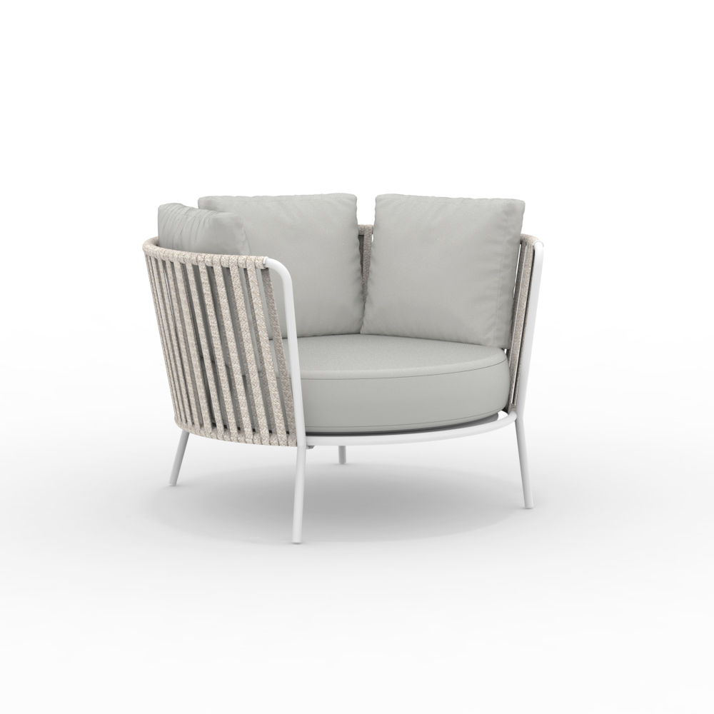 Struktura prej çeliku inox garanton soliditet dhe rezistencë ndaj agjentëve atmosferikë, ndërsa endja e litarit i jep një prekje lehtësie dhe rafinimi, duke e mbështjellë sediljen në një përqafim të rehatshëm. Dizajni ergonomik dhe linjat e rrumbullakosura sigurojnë një përvojë të këndshme dhe relaksuese uljeje.