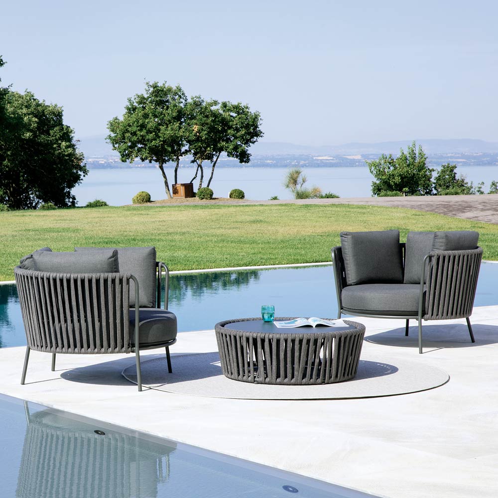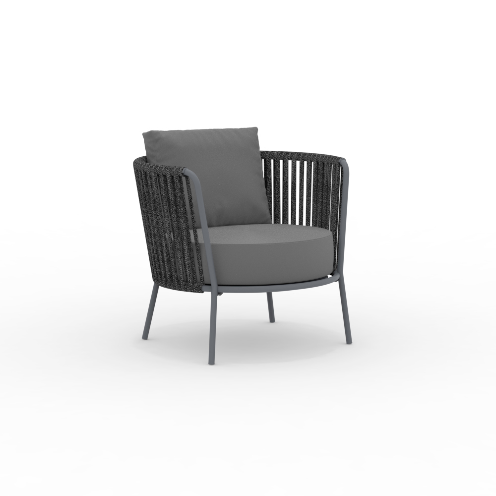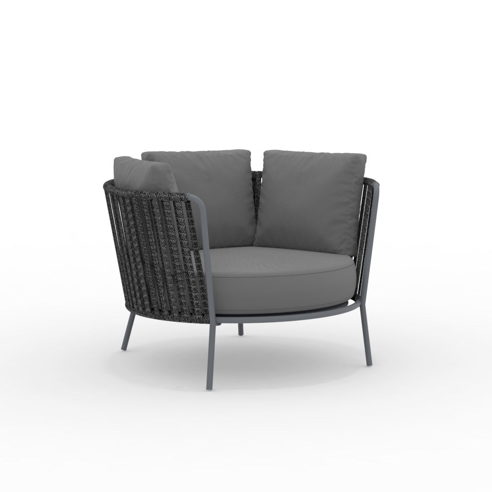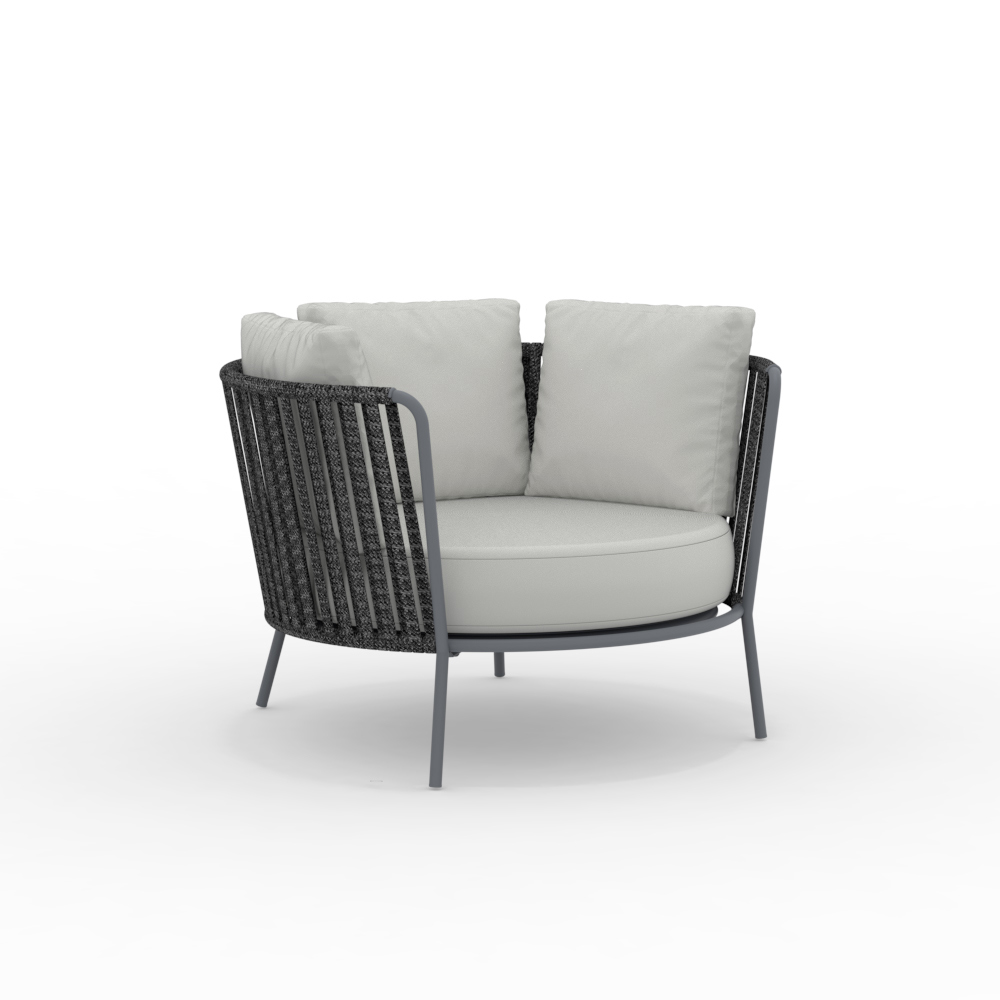 Struktura prej çeliku inox garanton soliditet dhe rezistencë ndaj agjentëve atmosferikë, ndërsa endja e litarit i jep një prekje lehtësie dhe rafinimi, duke e mbështjellë sediljen në një përqafim të rehatshëm. Dizajni ergonomik dhe linjat e rrumbullakosura sigurojnë një përvojë të këndshme dhe relaksuese uljeje.