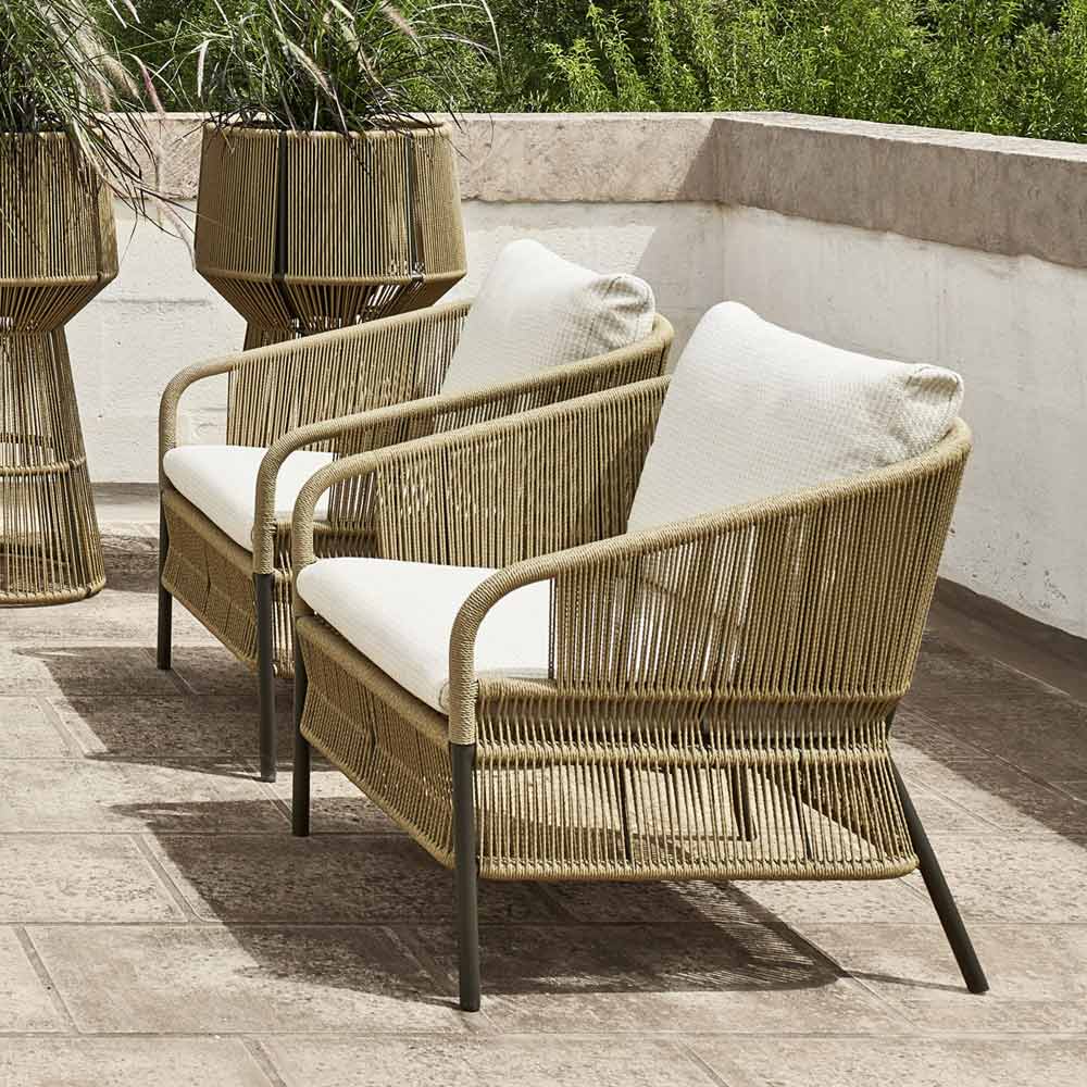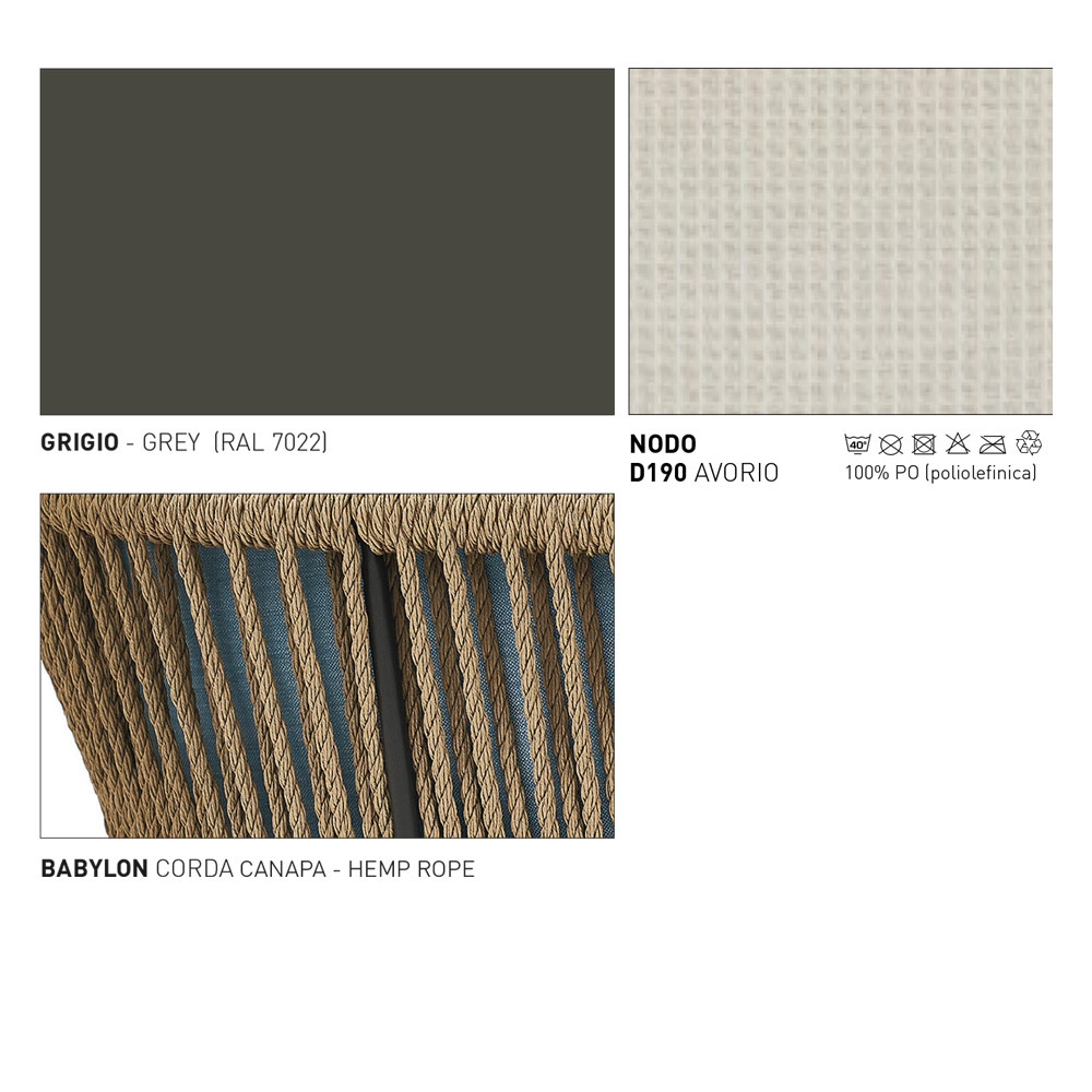 Kolltukë në natyrë me strukturë prej alumini të lyer me pluhur me finiturë gri , ndenjëse e endur me dorë në litar ngjyrë kërpi dhe dy jastëkë ngjyrë fildishi me mbushje të ndezur të përfshirë. Një zgjidhje mobilimi inovative dhe e freskët, e pasuruar nga përfundimet e mrekullueshme të propozuara që transformojnë mjedisin e jashtëm me rafinim.