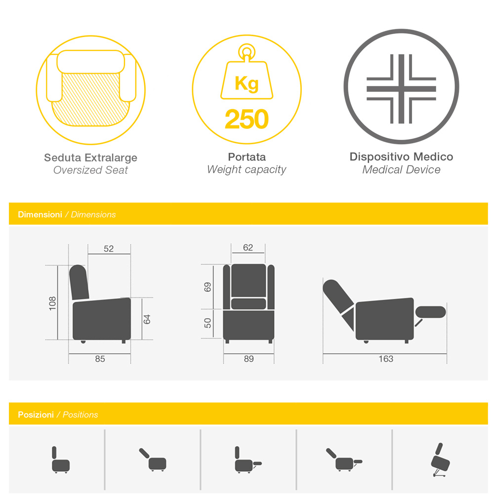 Falë teknologjisë së ngritjes dhe relaksimit është e mundur të shoqërohen lëvizjet kur jeni ulur dhe ngriheni. Telekomanda praktike ju lejon të rregulloni mbështetësen dhe mbështetësen e këmbëve (lëvizje të pavarura nga njëra-tjetra) sipas nevojave tuaja të rehatisë.