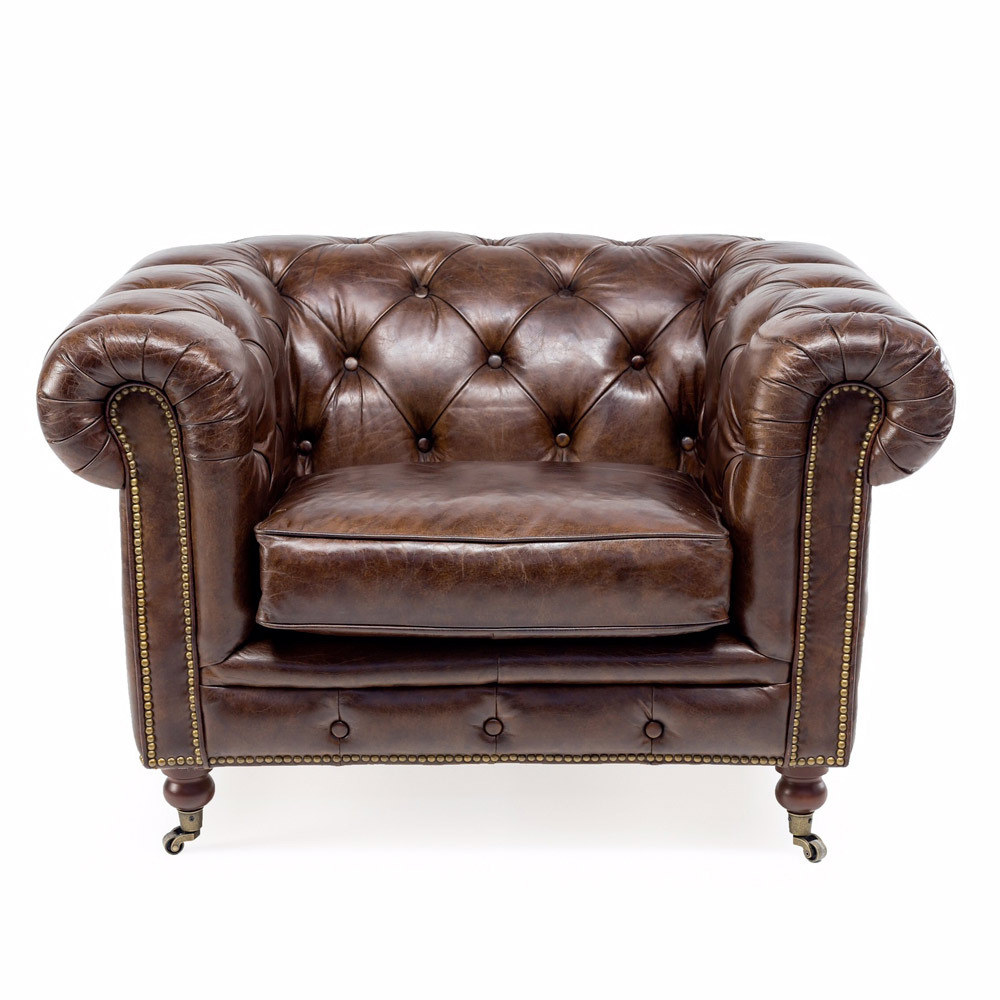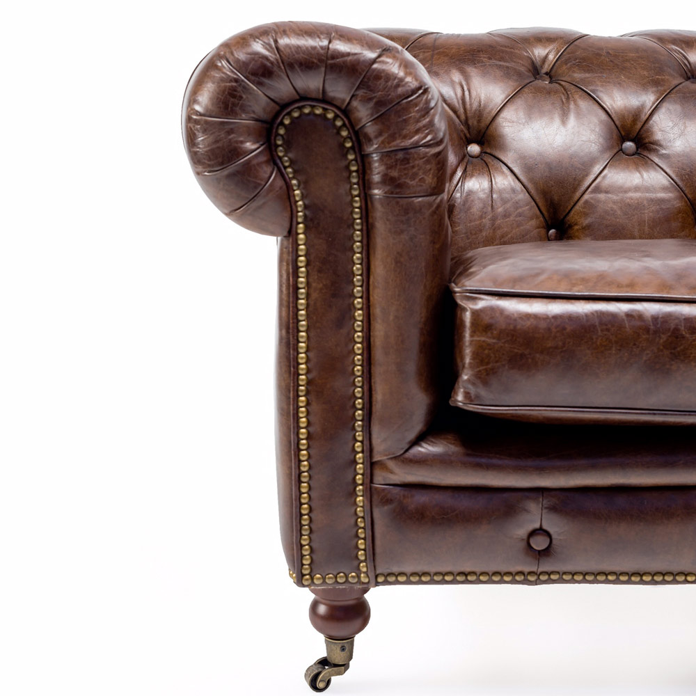 Kolltuku i dhomës së ndenjes me lëkurë të vërtetë kafe të errët , me stil klasik anglez.