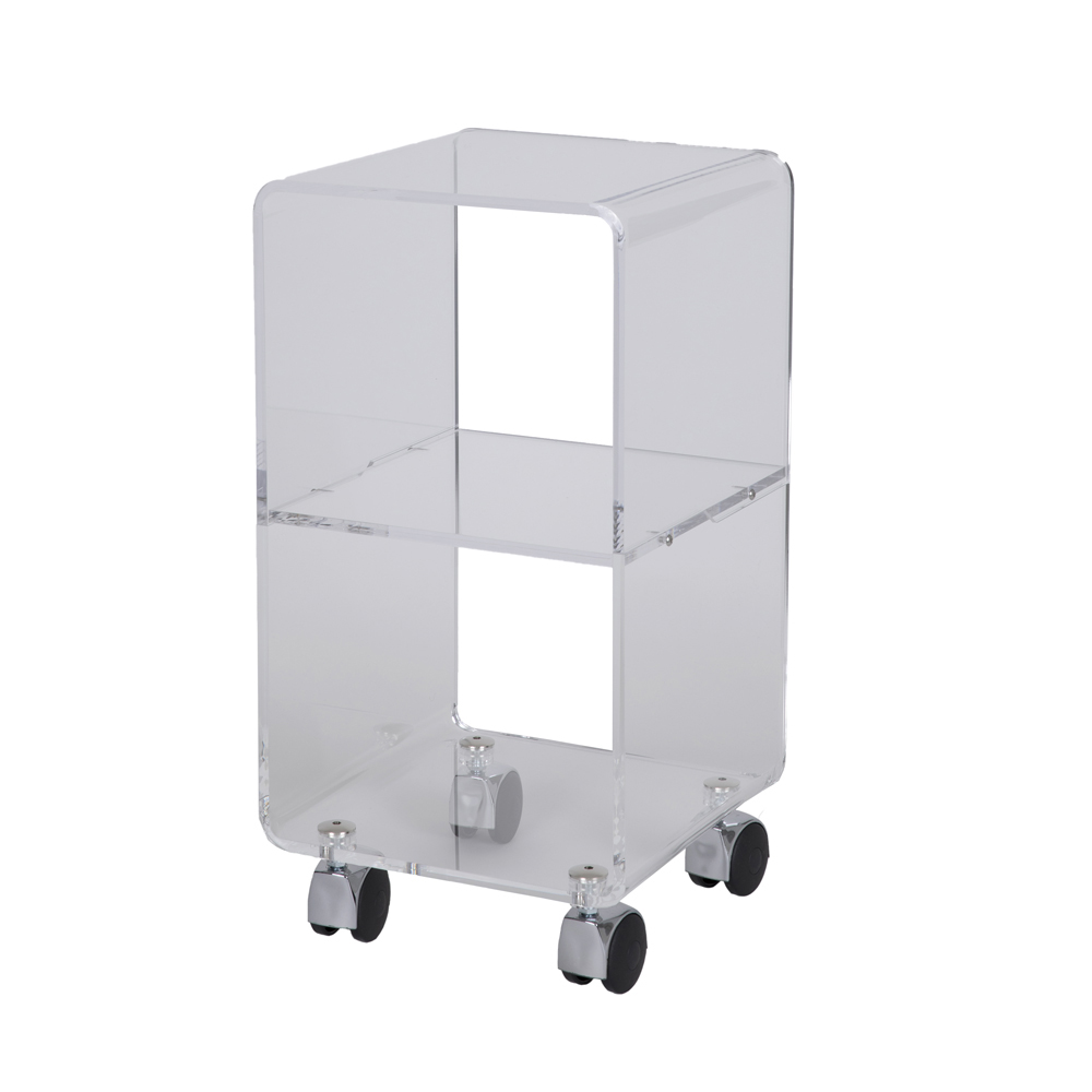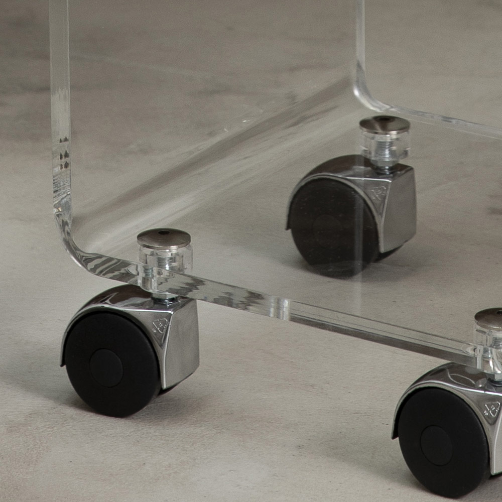 Kjo karrocë për dhomën e ndenjes me një dizajn kolone të pavarur është tërësisht prej xhami akrilik transparent me trashësi 8 mm me 1 ose 3 rafte dhe rrota rrotulluese. Përveç të qenit një complemento mobilje elegante dhe funksionale kjo është gjithashtu një objekt i shumë i zhdërvjellët dhe hapësirë për të shpëtuar të projektimit. Kristali akrilik është polimeri metakrilat që karakterizohet nga pastërtia e transparencës së tij që tejkalon kristalin natyror.