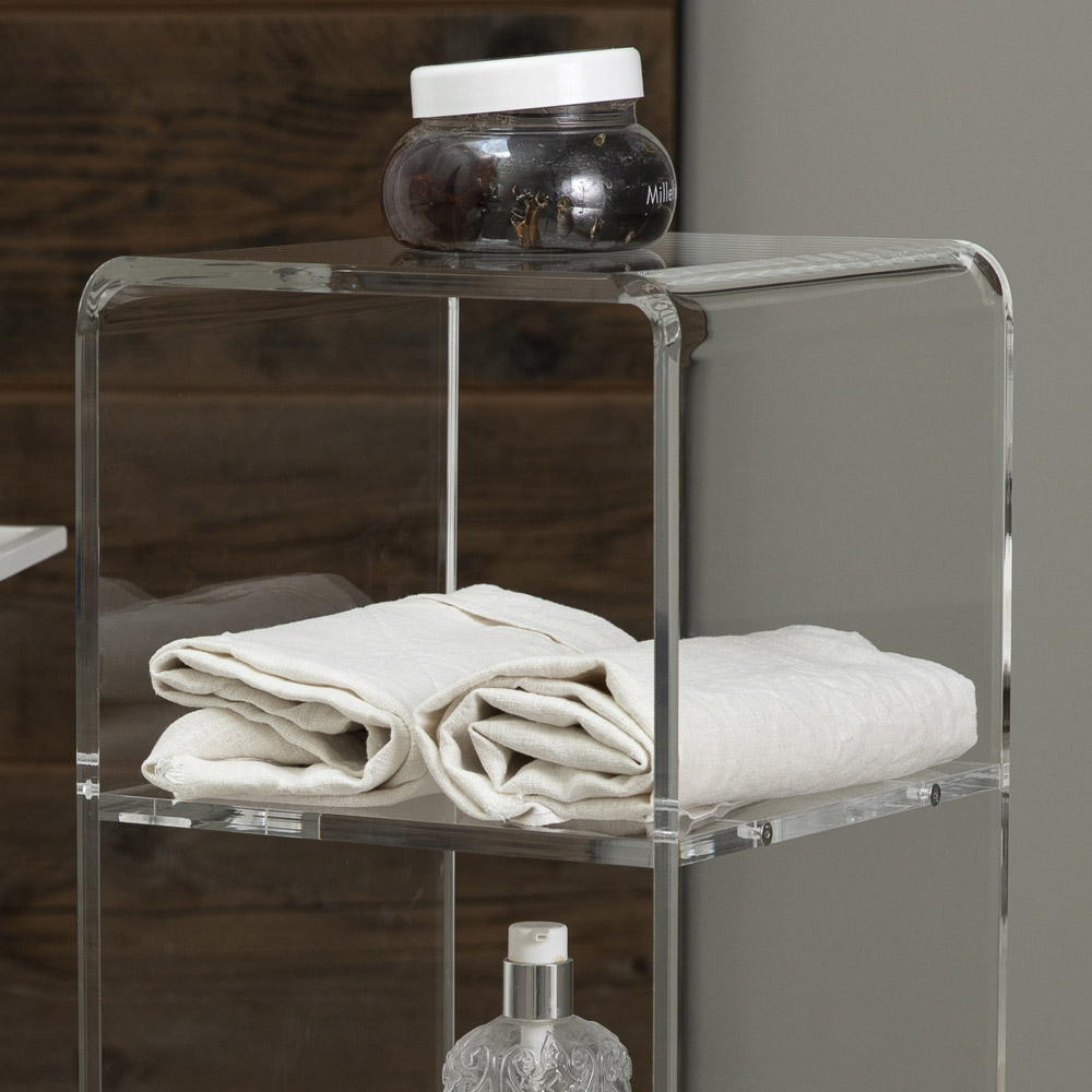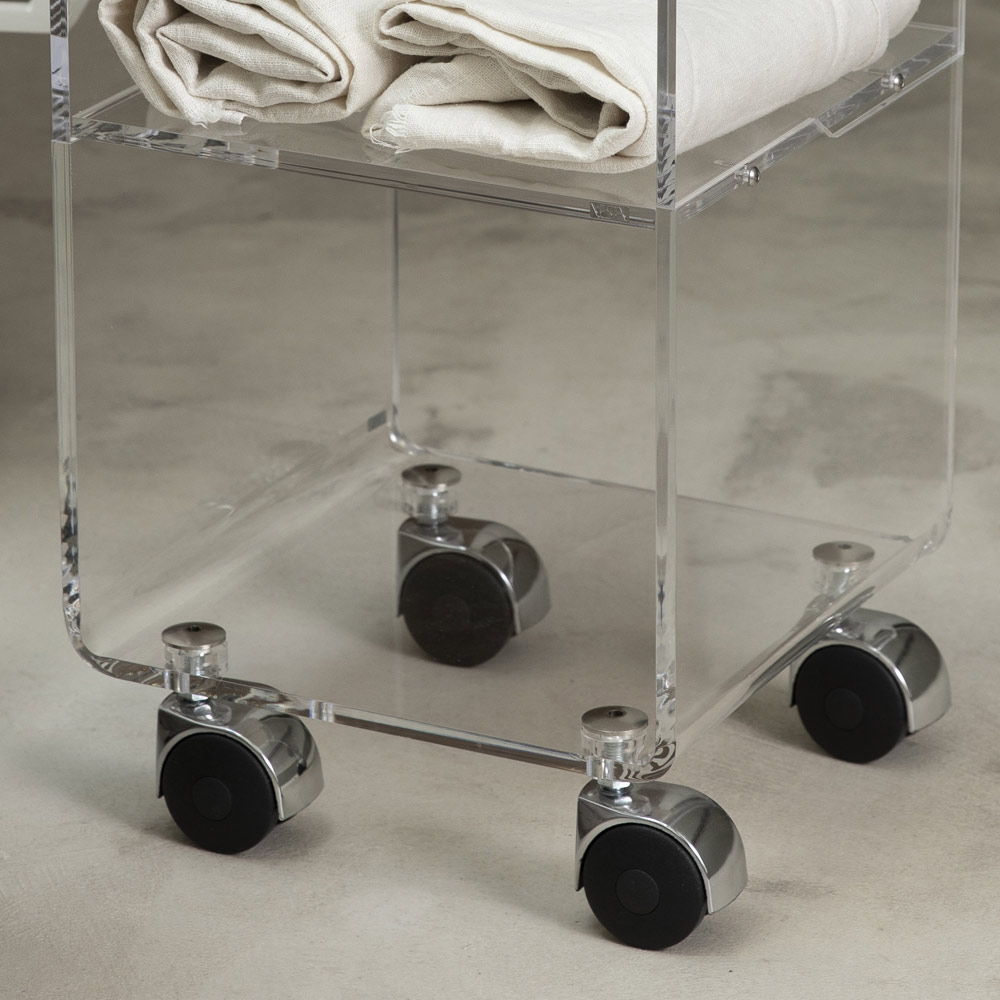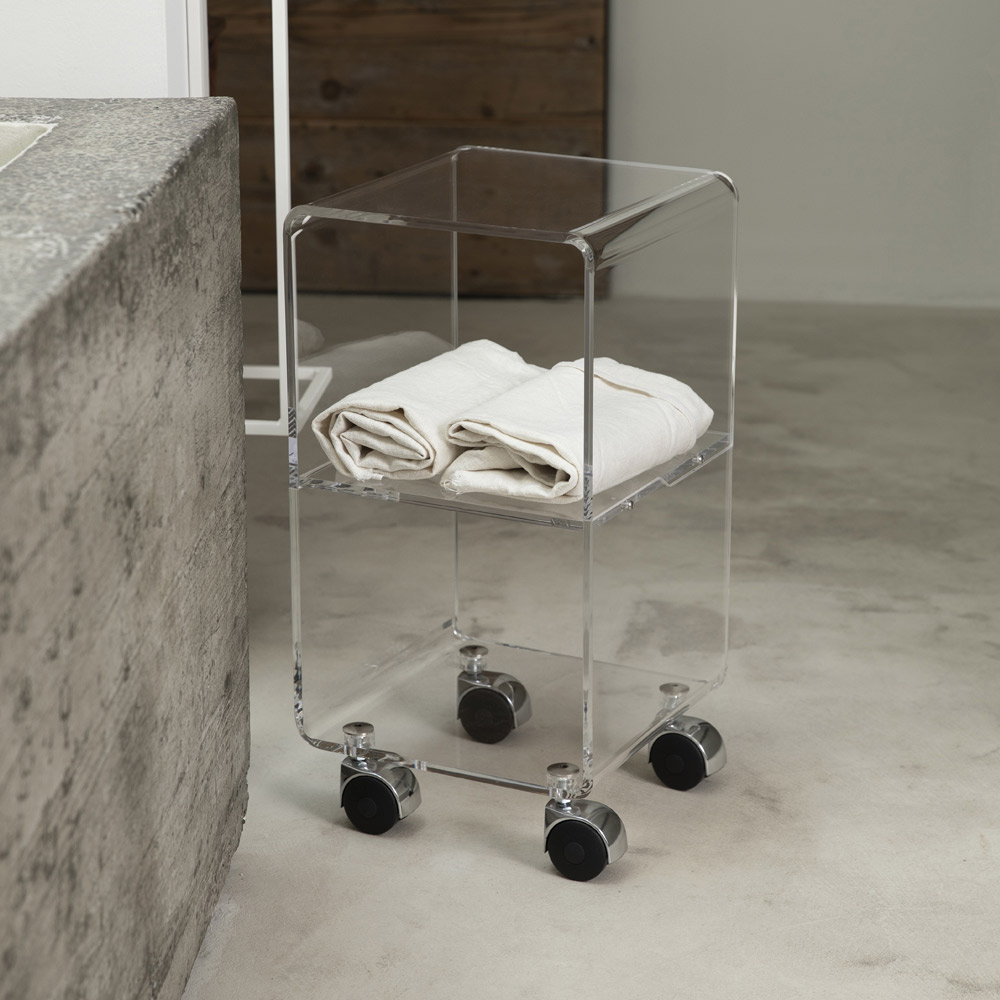 Karrocë kolone në kristal akrilik transparent me rrota dhe 1 ose 3 rafte, prodhim italian.