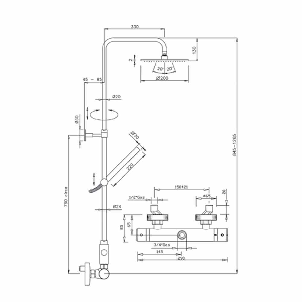Kolona dushi prej bronzi e kromuar me kokë dushi çeliku dhe dush dore ABS, produkt cilësor Made in Italy.