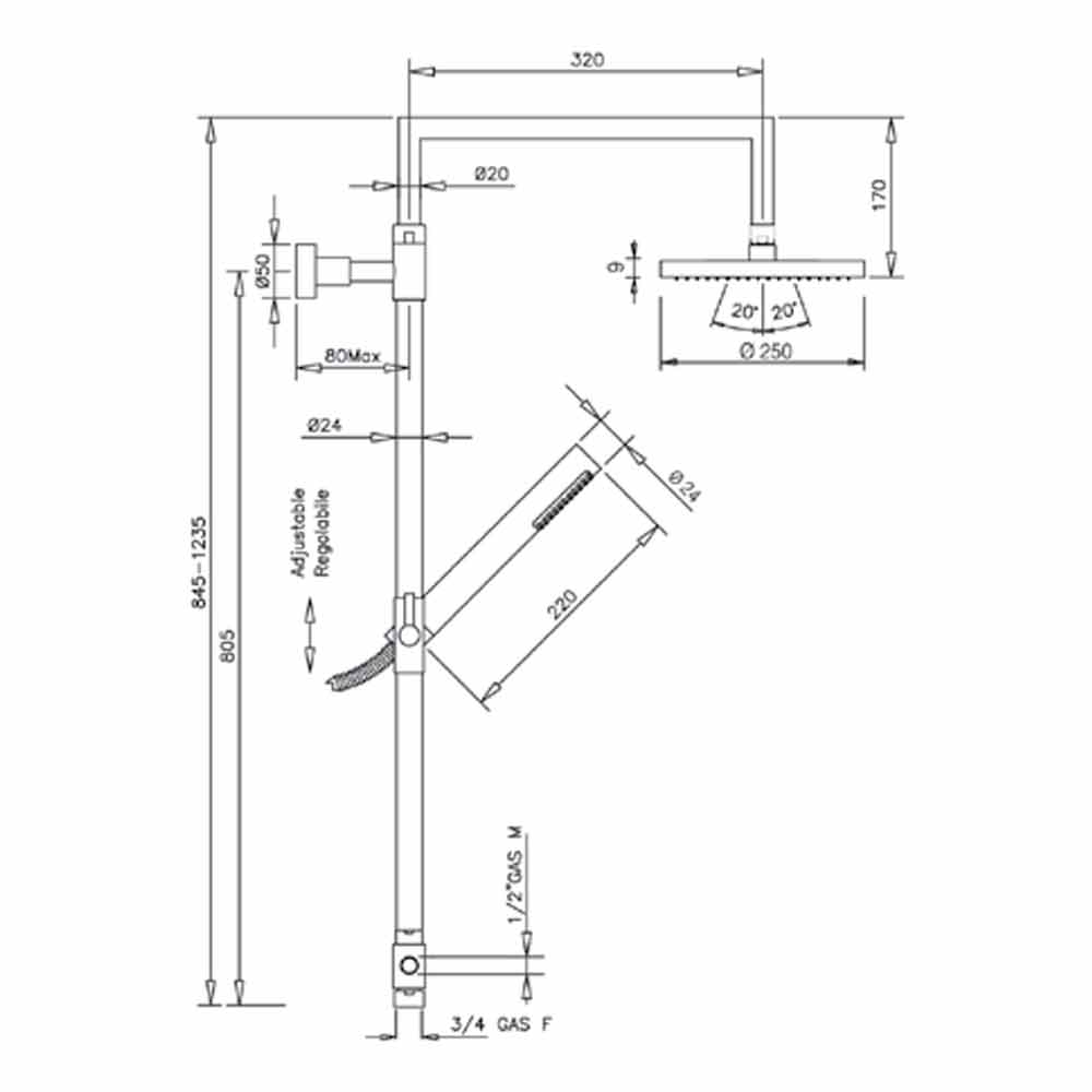 Kolona moderne e dushit prej bronzi të kromuar me diverter Prodhuar në Itali.