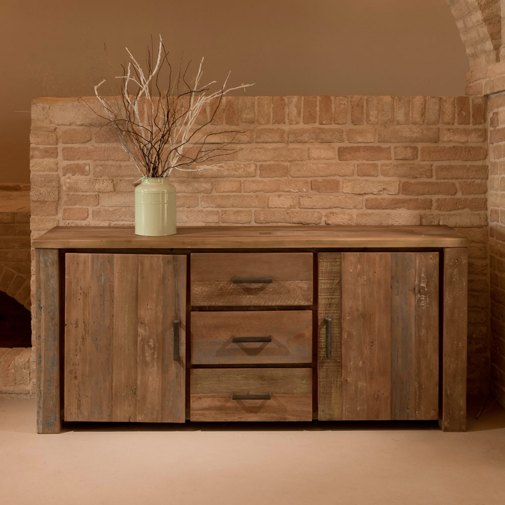 Bufe për ambiente të brendshme prej druri të ricikluar me finiturë Pandora me 2 dyer dhe 3 sirtarë qendrorë .