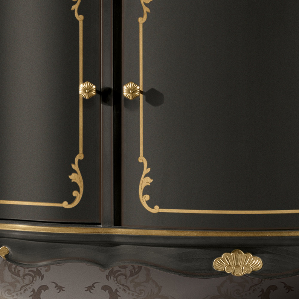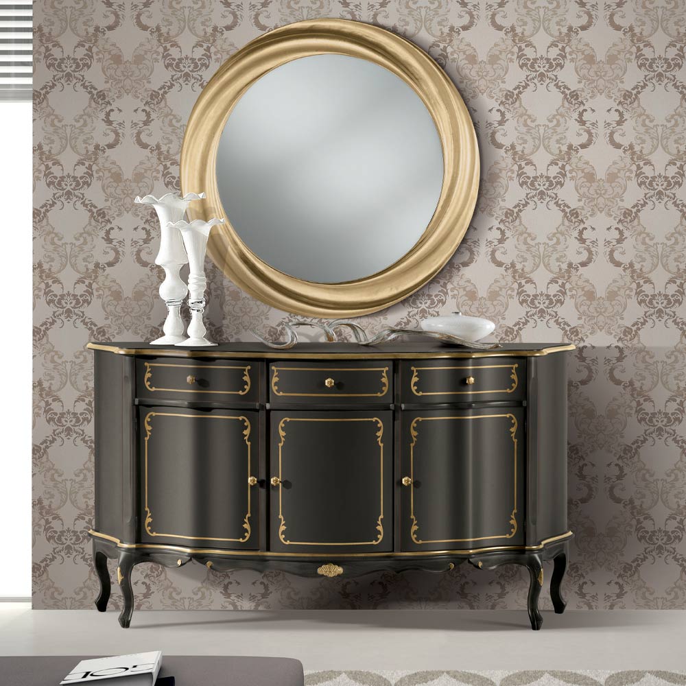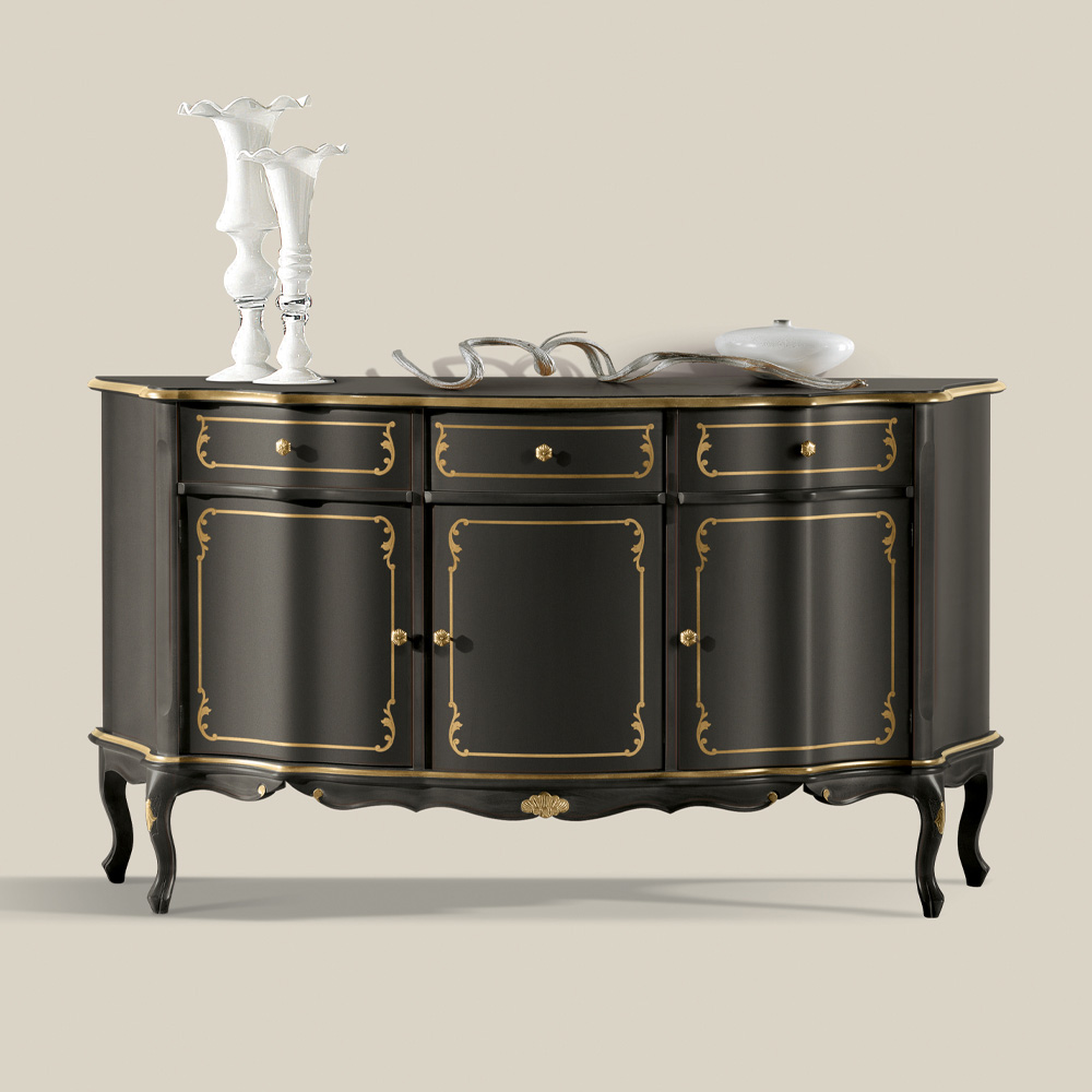 Bofoni i dhomës së ndenjes me 3 dyer dhe 3 sirtarë, i punuar me dru të inkorporuar dhe i disponueshëm me dekorime druri moka ose druri arre. Një komplement unik dhe i rafinuar, i bërë tërësisht në Itali nga mjeshtra të aftë , mjeshtër të artit që përfundojnë çdo komplement me mençuri dhe shije për elegancë. Prodhimi kryhet duke përdorur materiale të shkëlqyera , dhe duke kryer punënmedorë me kujdesin dhe profesionalizmin maksimal që i dallon produktet Made in Italy .