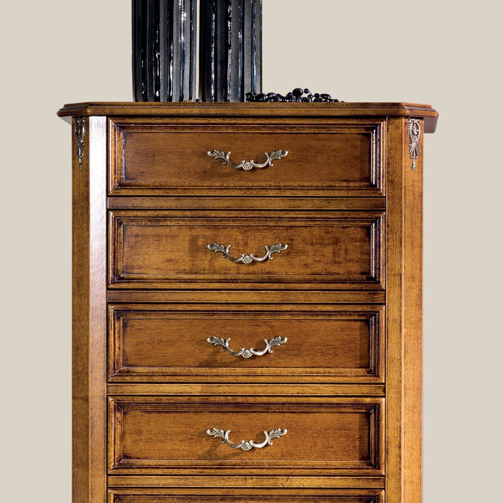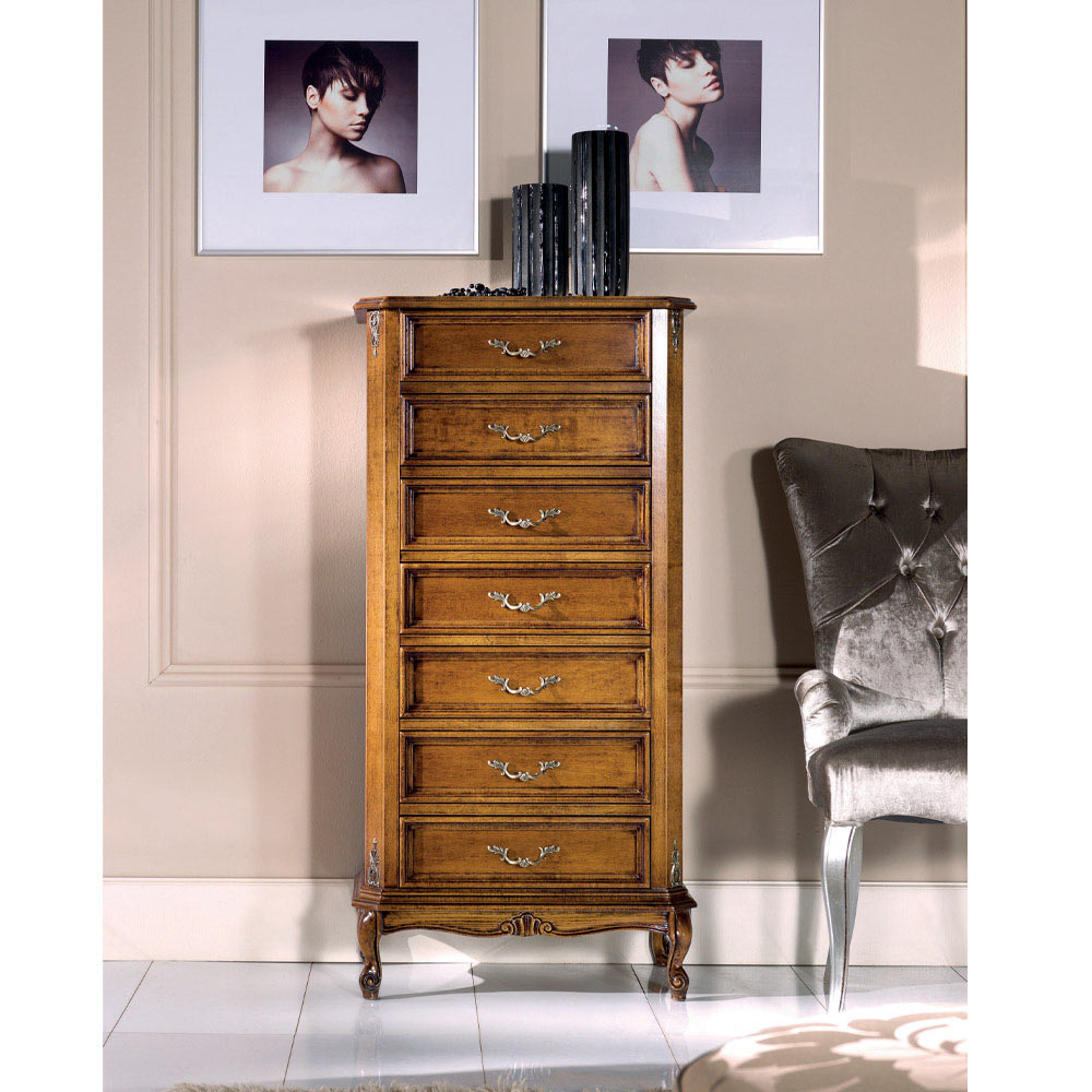 Komoda e stilit klasik, ideale për arredimin e dhomës së gjumit me elegancë dhe sqimë, tërësisht prej druri dhe e disponueshme në dekorime prej druri Bassano arre ose të bardhë dhe ari dhe në versionin me 5 sirtarë ose 7 sirtarë. Një mobilie unike dhe e rafinuar, tërësisht e prodhuar në Itali nga mjeshtra të aftë , e përfunduar me mençuri dhe shije për elegancë. Prodhimi kryhet duke përdorur materiale të shkëlqyera , dhe duke kryer punënmedorë me kujdesin dhe profesionalizmin maksimal që i dallon produktet Made in Italy .
