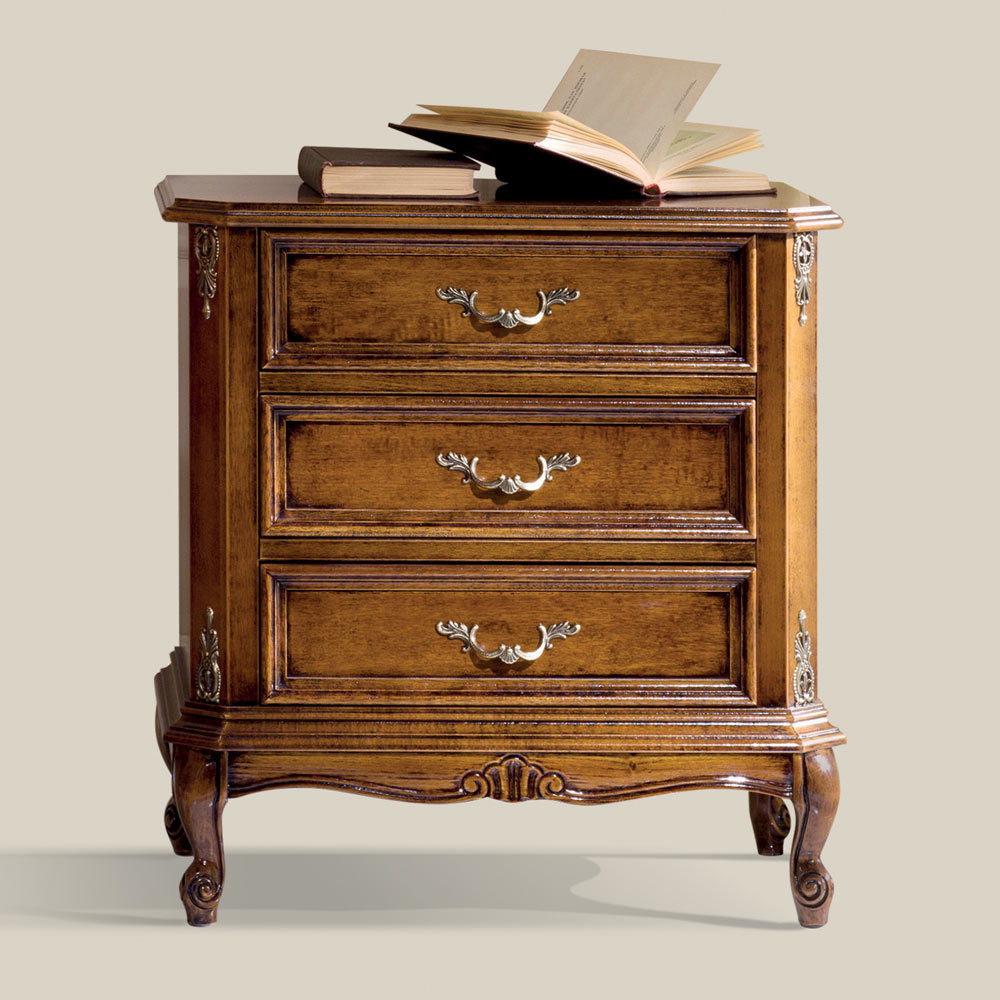 Komodina e stilit klasik, e përshtatshme për t'u përshtatur në mënyrë elegante në ambientin e dhomës së gjumit, ose në dhomën e ndenjes, duke krijuar një atmosferë të rafinuar dhe efektive. Eshte prej druri arre Bassano dhe ka 3 sirtare praktike. Prodhuar tërësisht në Itali dhe punuar me dorë nga mjeshtra të aftë , të përfunduara me mençuri dhe shije për elegancë. Prodhimi kryhet duke përdorur materiale të shkëlqyera , dhe duke kryer punënmedorë me kujdesin dhe profesionalizmin maksimal që i dallon produktet Made in Italy .