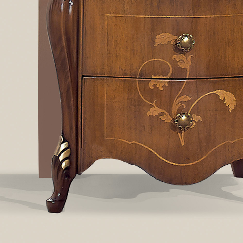 Komodinë për dhomën e gjumit prej arre Bassano dhe flori antik me veshje elegante dhe 3 sirtarë praktike.Një komplement unik dhe i rafinuar, i bërë tërësisht në Itali nga mjeshtra të aftë , mjeshtër të artit që përfundojnë çdo komplement me mençuri dhe shije për elegancë. Prodhimi kryhet duke përdorur materiale të shkëlqyera , dhe duke kryer punënmedorë me kujdesin dhe profesionalizmin maksimal që i dallon produktet Made in Italy .