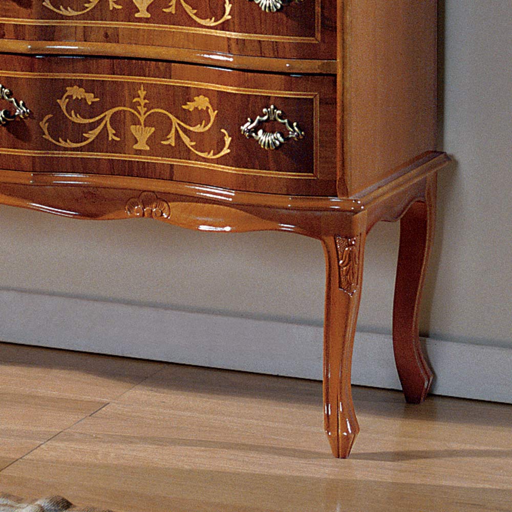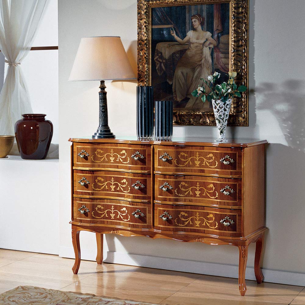 Komodë e stilit klasik, prej druri të çmuar të lëmuar arre me veshje të artë . Kjo mobilje praktike dhe e rafinuar me 6 sirtarë është tërësisht e prodhuar në Itali dhe e punuar me dorë nga mjeshtra të aftë , e përfunduar me mjeshtëri dhe shije për elegancë. Prodhimi kryhet duke përdorur materiale të shkëlqyera , dhe duke kryer punënmedorë me kujdesin dhe profesionalizmin maksimal që i dallon produktet Made in Italy .