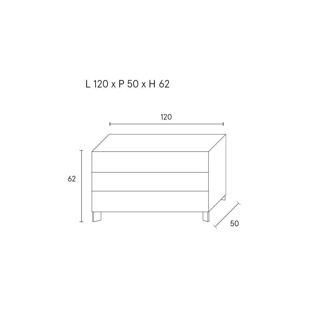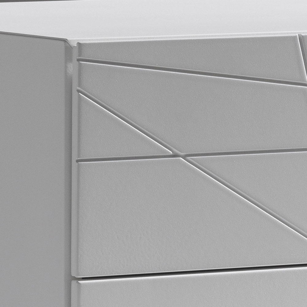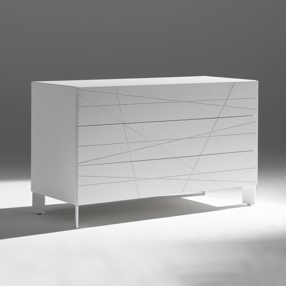 Një komodinë me një dizajn bashkëkohor dhe rigoroz, që paraqet një identitet të fortë grafik dhe linja të pastra. Prerjet gjeometrike në pjesën e përparme krijojnë një ndërthurje elegante linjash që bashkëvepron me dritën, duke e bërë këtë veshje një pjesë të vërtetë tërheqëse në dhomën e gjumit.