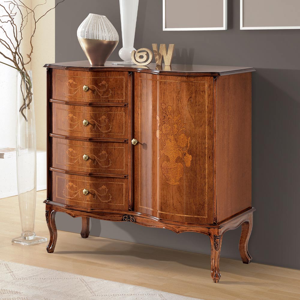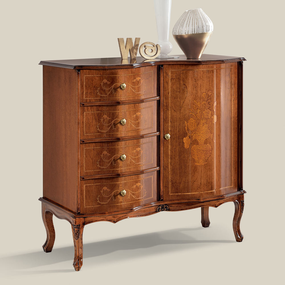 Komo me një derë dhe katër sirtarë në një stil klasik dhe elegant .E bërë me dru të çmuar të lëmuar arre me veshje të artë që e bëjnë atë një plotësues të rafinuar të aftë për të zbukuruar mjedisin në të cilin është vendosur. Prodhuar tërësisht në Itali dhe punuar me dorë nga mjeshtra të aftë , të përfunduara me mençuri dhe shije për elegancë. Prodhimi kryhet duke përdorur materiale të shkëlqyera , dhe duke kryer punënmedorë me kujdesin dhe profesionalizmin maksimal që i dallon produktet Made in Italy .