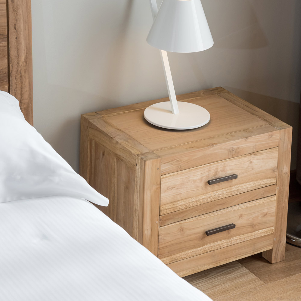 Kjo komodinë pranë shtratit prej druri të fortë tik është një mobilje kompakte dhe elegante, ideale për të kompletuar dhomën tuaj të gjumit me një stil natyral dhe të përjetshëm. Mjeshtëria dhe fibrat natyrale të drurit i japin kësaj pjese një pamje të ngrohtë dhe autentike.