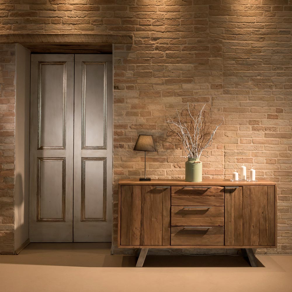 Bufe të brendshme prej druri të ricikluar me ngjyrë kafeje natyrale me 2 dyer dhe 3 sirtarë me këmbë metalike . Ky grup mobilimi është fjalë për fjalë unik pikërisht sepse mishëron historinë e veçantë të materies së jetuar. Përpunimi bëhet në pjesën më të madhe sipas procedurave artizanale . Çdo gërvishtje dhe papërsosmëri, çdo mbresë në dru, dëshmon origjinalitetin e një të shkuare që merr jetë të re. Druri tropikal i ricikluar ligjërisht nga objektet e vjetra, varkat dhe ndërtesat e braktisura trajtohet dhe pastrohet me mjeshtëri për të rifituar dinjitetin dhe shkëlqimin. Ky produkt kombinon thelbin e shijes rustike me format e dizajnit bashkëkohor dhe me disa detaje të stilit industrial .
