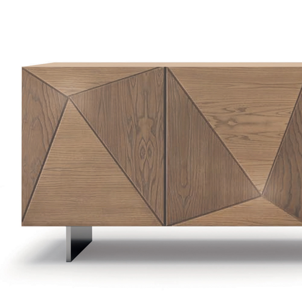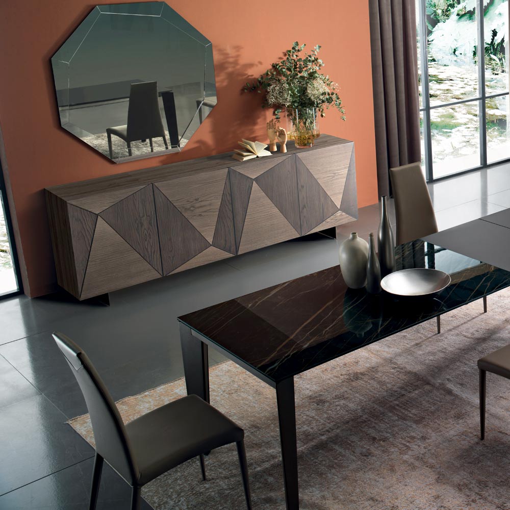 Bofoni i dhomës së ndenjes i bërë me rimeso hiri me fije lisi me nyje të pajisura me 3 ose 4 dyer të pikturuara të punuara me dorë me sistem hapjeje push&pull brenda të cilit gjejmë rafte xhamitransparent të temperuar (6 mm të trasha, ngarkesa maksimale 20 kg) dhe këmbë linjash. Një aksesor mobilimi me një stil imponues dhe të sofistikuar , ideal për ata që duan të pasurojnë mjediset e tyre në një mënyrë sa funksionale aq edhe të rafinuar dhe moderne. Estetika e tij ekskluzive është bërë unike nga mjeshtëria e veçantë që mbulon dyert e lyera me dorë, të cilat rrisin më tej cilësinë dhe vlerën e produktit. Prodhimi 100% Made in Italy dhe përdorimi i lëndëve të para me cilësi të lartë i japin gjithashtu bufesë soliditet , rezistencë dhe qëndrueshmëri të shkëlqyer me kalimin e kohës për një rezultat optimal.