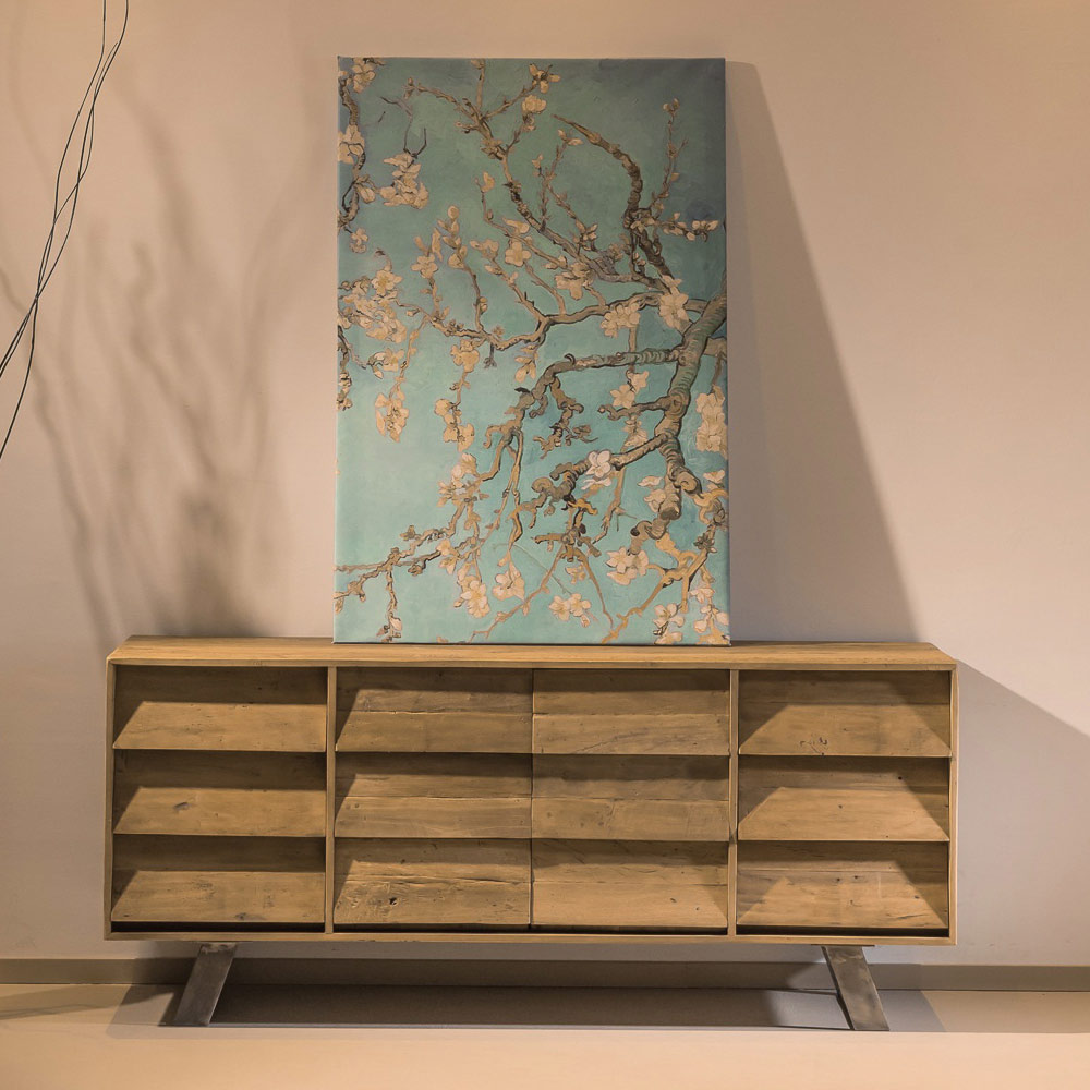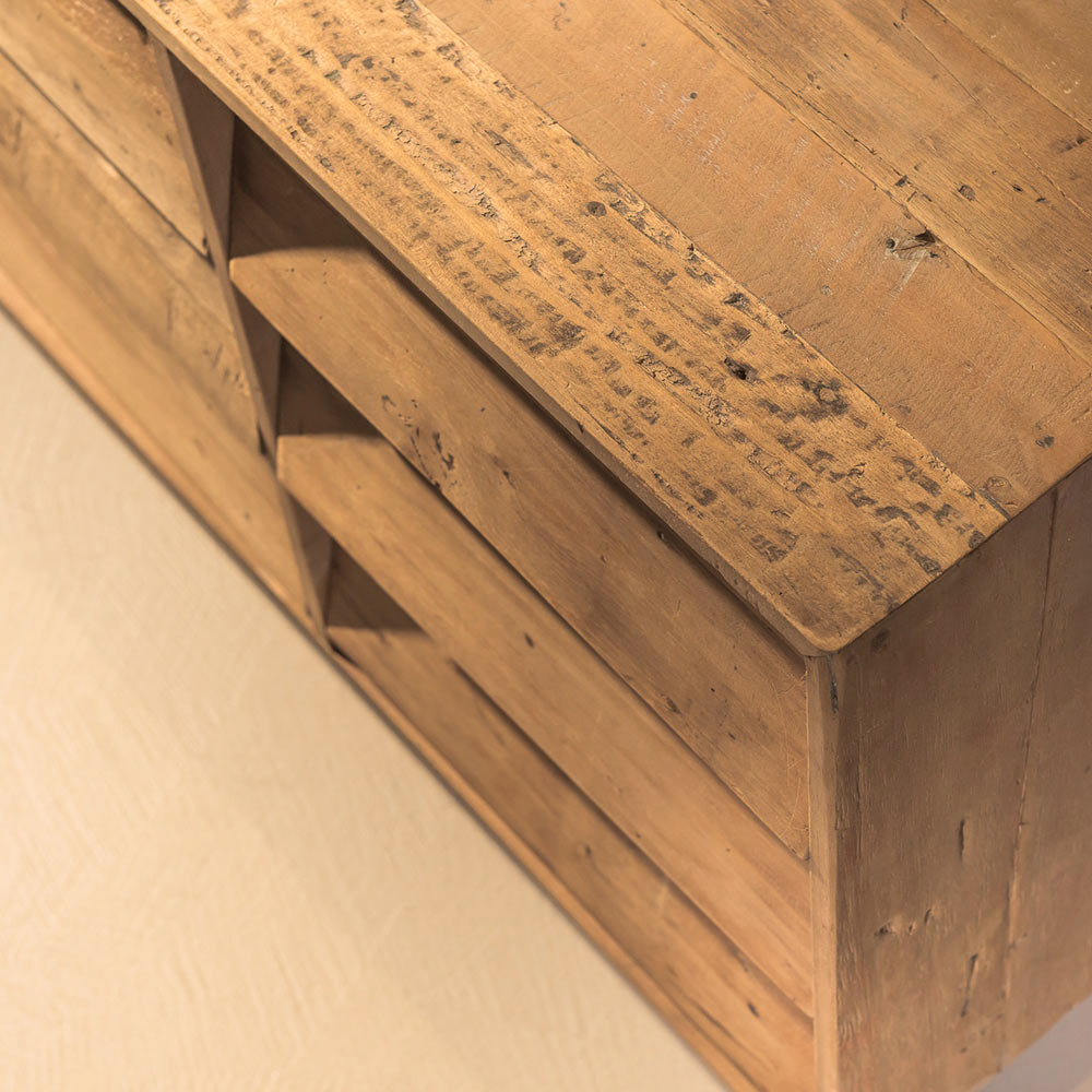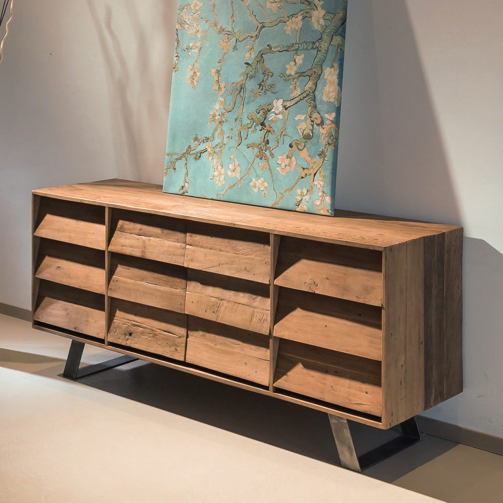 Bufe të brendshme prej druri të ricikluar me ngjyrë kafeje natyrale me ballina të mbyllura, 2 dyer qendrore dhe 6 sirtarë anësor . Ky grup mobilimi është fjalë për fjalë unik pikërisht sepse mishëron historinë e veçantë të materies së jetuar. Përpunimi bëhet në pjesën më të madhe sipas procedurave artizanale . Çdo gërvishtje dhe papërsosmëri, çdo mbresë në dru, dëshmon origjinalitetin e një të shkuare që merr jetë të re. Druri tropikal i ricikluar ligjërisht nga objektet e vjetra, varkat dhe ndërtesat e braktisura trajtohet dhe pastrohet me mjeshtëri për të rifituar dinjitetin dhe shkëlqimin. Ky produkt kombinon thelbin e shijes rustike me format e dizajnit bashkëkohor dhe me disa detaje të stilit industrial .