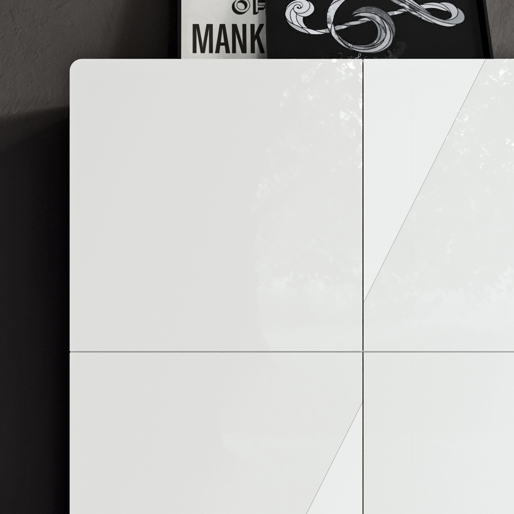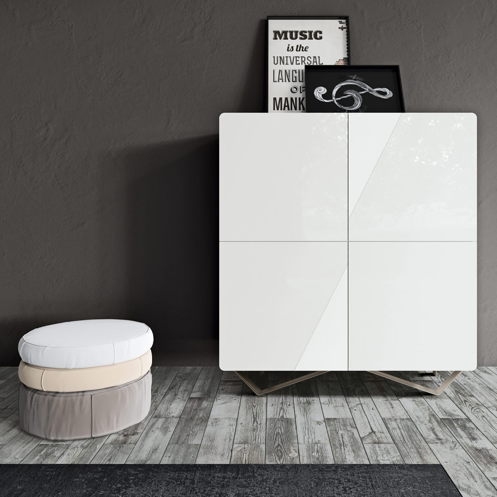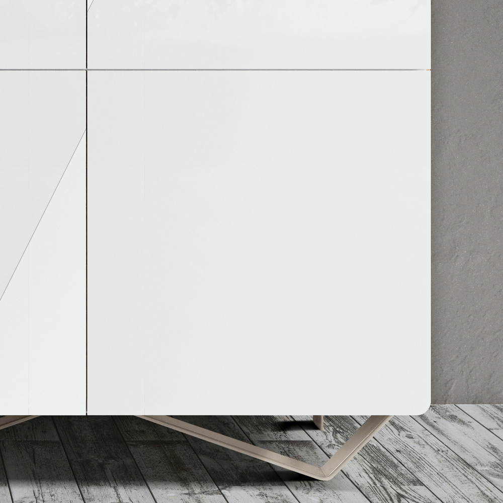 Bofoni i dhomës së ndenjes i bërë me guaskëMDF me finiturë të bardhë , këmbë hekuri me finiturë nikel, 4rafte të brendshme MDF, paneli i pasëm prej druri të ngurtë shumështresor , dyer me finiturë xhami të bardhë me futje të bardha , tërësisht Prodhuar në Itali. Produkti është pjesë e linjës së re të produkteve moderne të prodhuara me respekt për natyrën. Ky bufe elegant karakterizohet nga funksionaliteti dhe cilësia e lartë e mjeshtërisë italiane. Një dizajn i gjithanshëm dhe origjinal i krijuar për të pasur përdorime të ndryshme brenda zonave të ndryshme të shtëpisë, duke kompletuar arredimin në një mënyrë ekskluzive bazuar në shijet dhe nevojat tuaja.