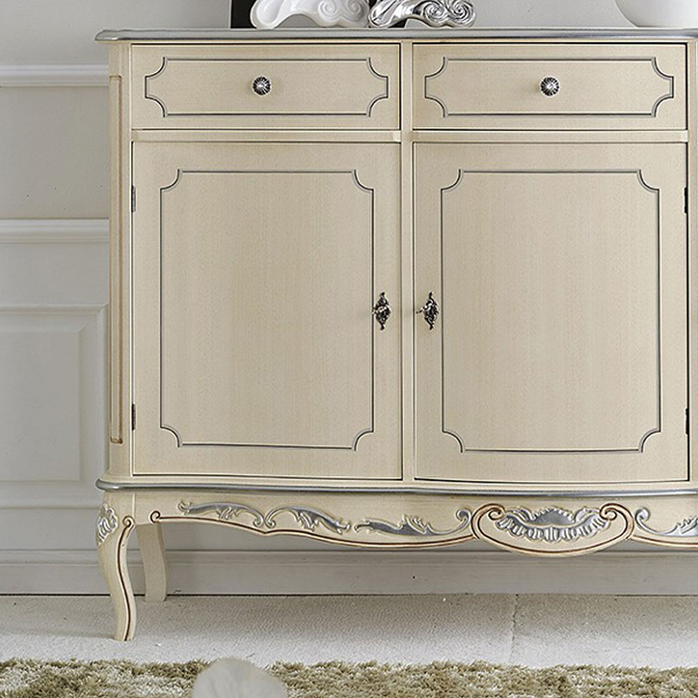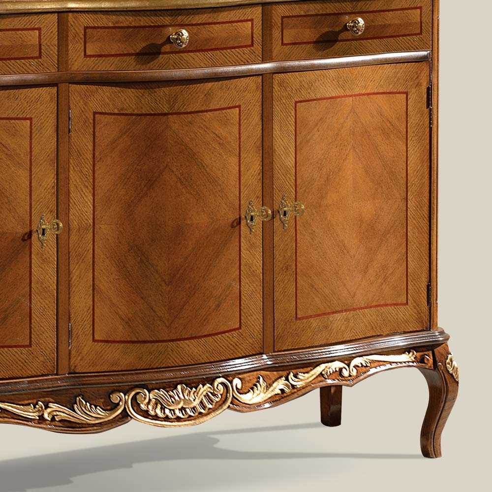 Bufe e rafinuar e stilit klasik të dhomës së ndenjes e disponueshme në dru të imët me dekorim arre Bassano me detaje ari antike ose të bardha me detaje argjendi. Bufeja ka tre sirtarë dhe tre dyer. Elegant dhe pa kohë, ky bufe në stil klasik është ideal për të krijuar ambiente mbresëlënëse, falë detajeve të tij unike. Prodhuar tërësisht në Itali dhe punuar me dorë nga mjeshtra të aftë , të përfunduara me mençuri dhe shije për elegancë. Prodhimi kryhet duke përdorur materiale të shkëlqyera , dhe kryerja e punësmedorë me kujdesin dhe profesionalizmin maksimal që i dallon produktet Made in Italy .