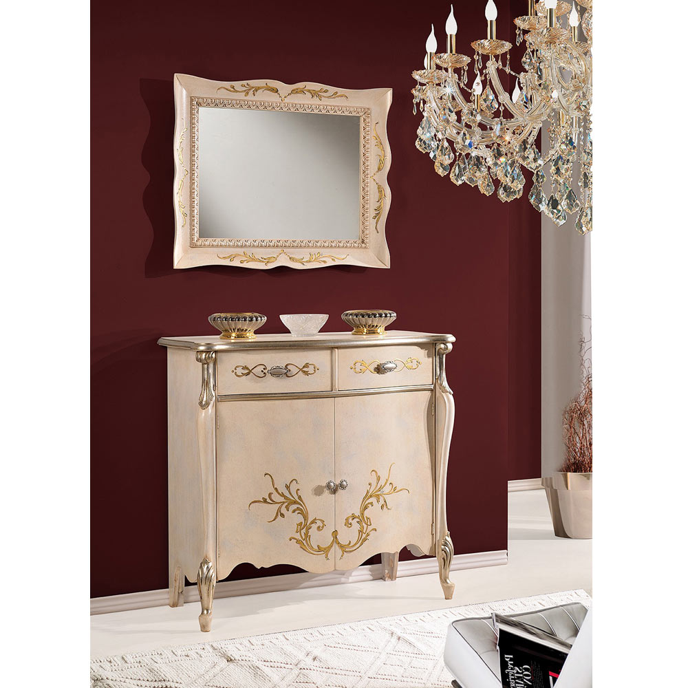 Bufeja e dhomës së ndenjes me një stil klasik dhe elegant të kompletuar me 2 dyer dhe 2 sirtarë praktike, e disponueshme në ngjyrë arre Bassano dhe flori antike ose veshje antike të bardhë me veshje. Një komplement unik dhe i rafinuar, i bërë tërësisht në Itali nga mjeshtra të aftë , mjeshtër të artit që përfundojnë çdo komplement me mençuri dhe shije për elegancë. Prodhimi kryhet duke përdorur materiale të shkëlqyera , dhe duke kryer punënmedorë me kujdesin dhe profesionalizmin maksimal që i dallon produktet Made in Italy .