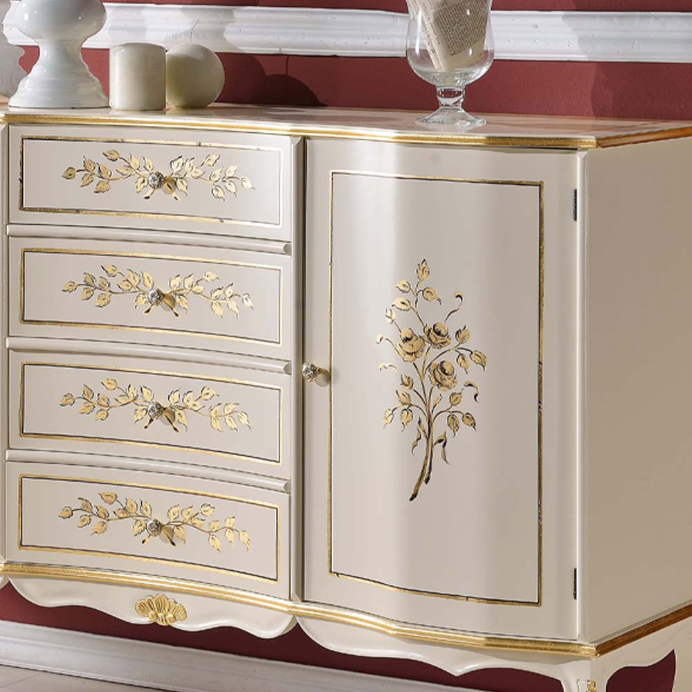 Bufe në stil klasik dhe elegant me 2 dyer dhe 4 sirtarë . I gjithë stili dhe mjeshtëria që karakterizon mjeshtërinë shfaqen në këtë pjesë të kushtueshme të mobiljeve të bëra me dru të çmuar, të disponueshme në dekorime arre ose të bardhë , një plotësues i rafinuar i aftë për të zbukuruar mjedisin në të cilin është vendosur. Prodhuar tërësisht në Itali dhe punuar me dorë nga mjeshtra të aftë , të përfunduara me mençuri dhe shije për elegancë. Prodhimi kryhet duke përdorur materiale të shkëlqyera , dhe duke kryer punënmedorë me kujdesin dhe profesionalizmin maksimal që i dallon produktet Made in Italy .
