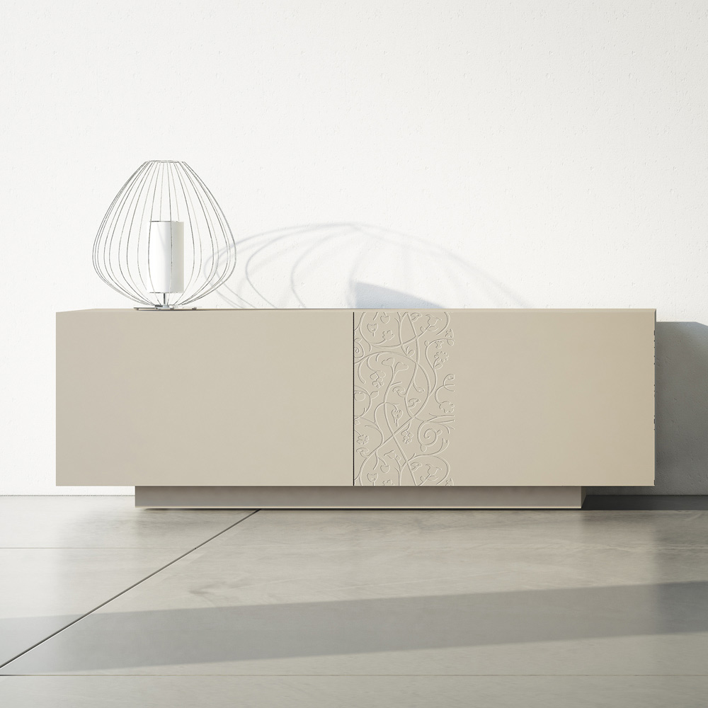 Bofoni i dhomës së ndenjes me strukturë MDF me llak mat gri alpaka e përbërë nga 2 dyer rrëshqitëse koplanare të cilat garantojnë funksionalitet dhe prakticitet të madh dhe nga bazamenti i lakuar i cili ofron shumë stabilitet. Ky produkt është plot shije dhe dizajn falë përfundimeve të tij elegante dhe të rafinuara dhe dekorimit të pjesshëm me reliev të dyerve që e bën atë unik në llojin e tij. Materialet e ndryshme të përdorura për ndërtimin ofrojnë cilësi dhe rezistencë të madhe me kalimin e kohës, duke i dhënë produktit atë prekje unike dhe të paharrueshme.
