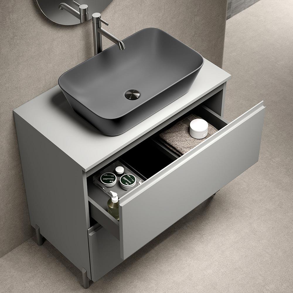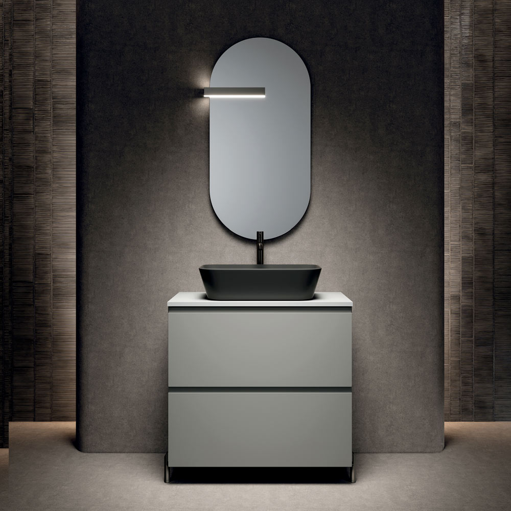 Një zgjidhje e projektuar për ata që duan një dollap banjoje modern me këmbë , të karakterizuar nga përfundime mat në modë dhe detaje antraciti me një ndikim të fortë estetik.