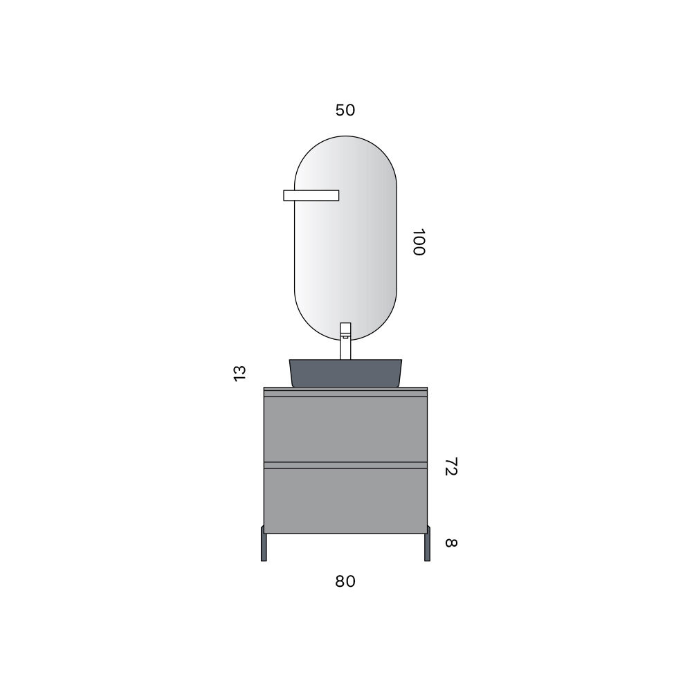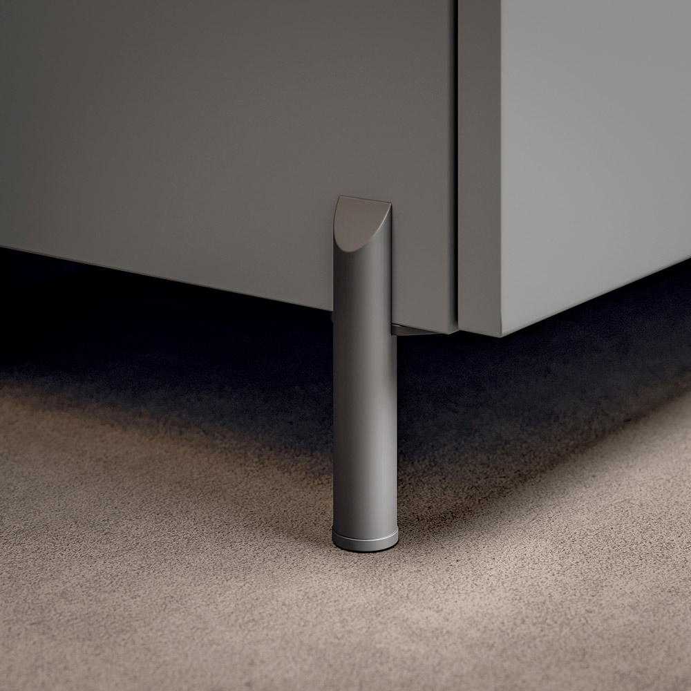 Baza me dy sirtarë të mëdhenj me ngjyrë gri mat garanton hapësirë të bollshme magazinimi dhe një estetikë të pastër, e përforcuar nga prania e këmbëve të jashtme prej antraciti me lartësi 8 cm që japin lehtësi vizuale dhe stabilitet më të madh.